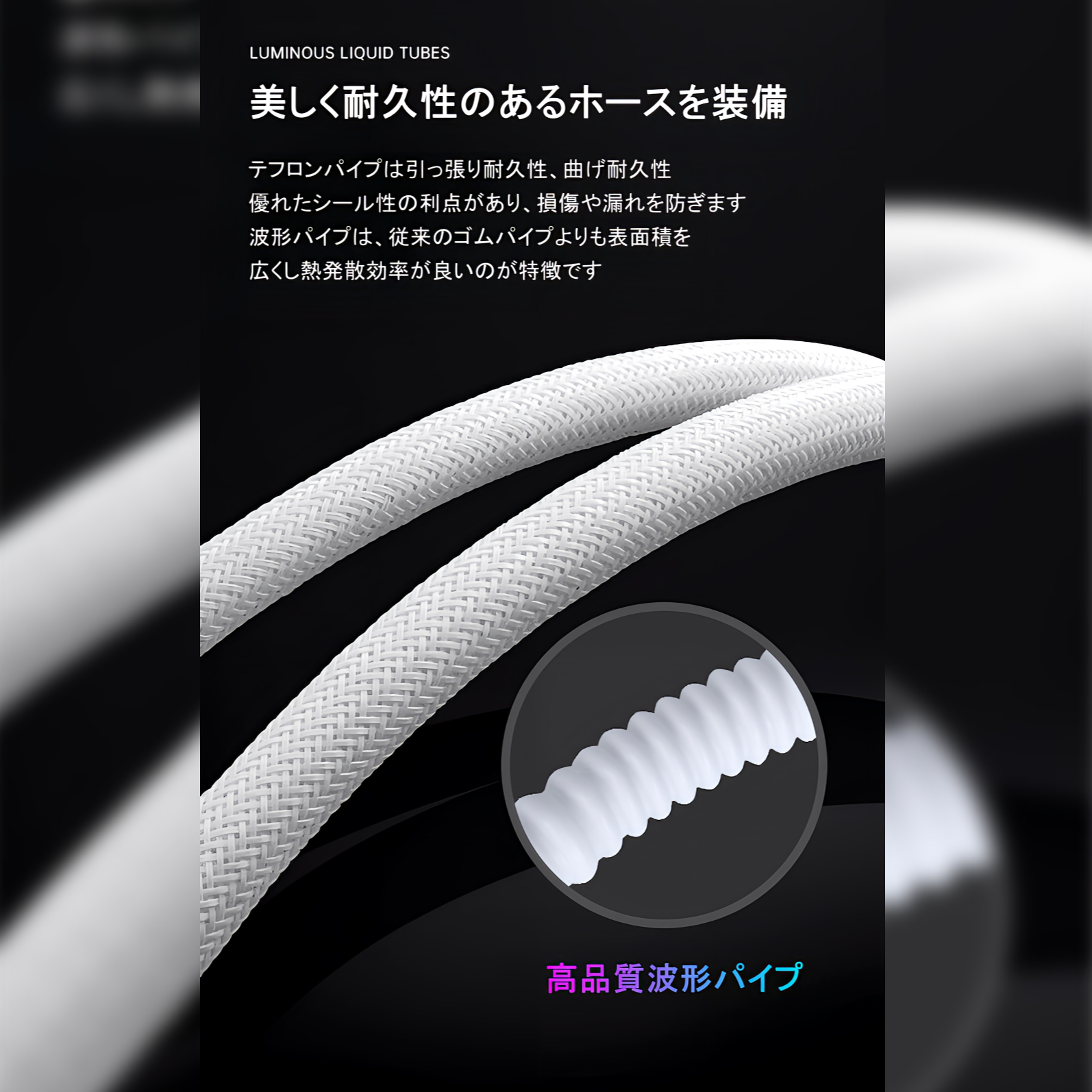 【特徴】CPUヘッドに温度表示機能を搭載しており、リアルタイムでCPU温度を確認できる便利な設計となっています。インフィニティ―ミラーデザインとARGB対応のLED搭載で美しいライティング効果を実現し、ゲーミングPCに個性的で華やかな演出を加えます。