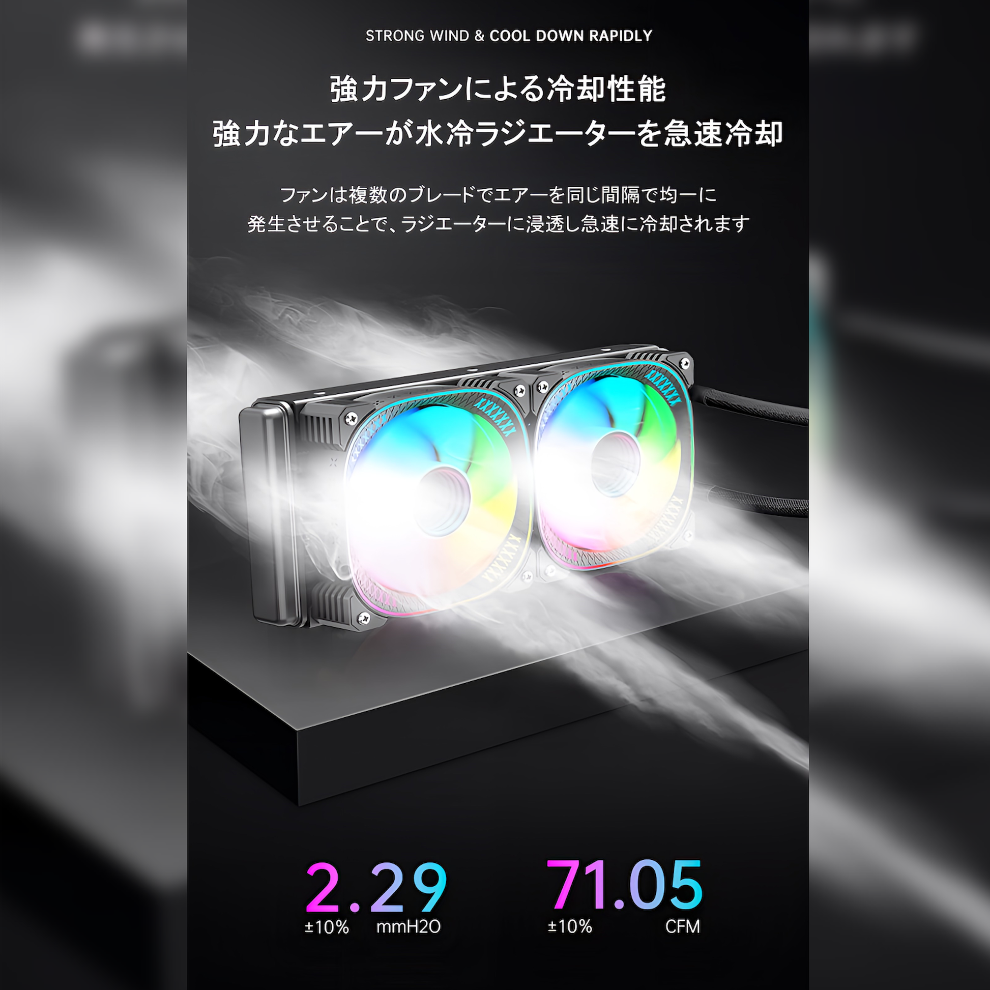 【機能】CPUを効率的に冷却する高い性能を持つ本製品は、安定した動作をサポートします。また、ARGB 5v 3pinに対応しており、対応するマザーボードやARGBコントローラーを使用することで、LEDの色を好みに合わせて調整することが可能です。