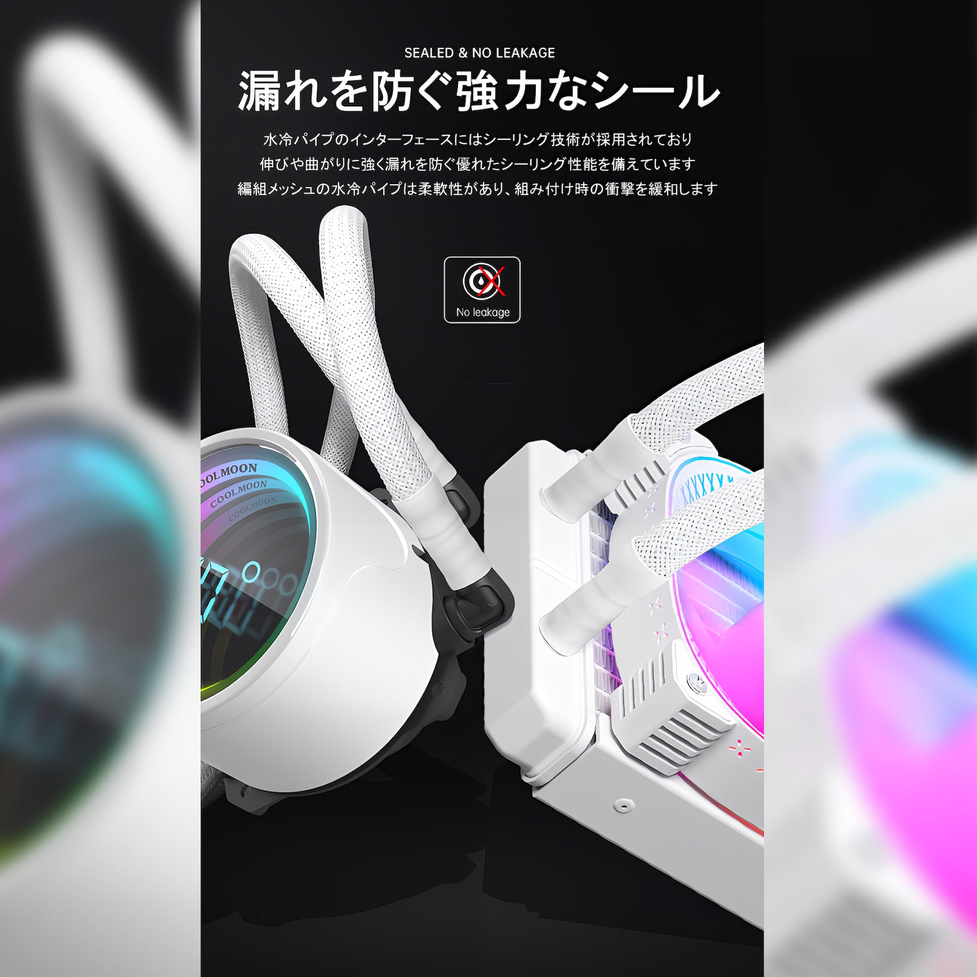 【特徴】CPUヘッドに温度表示機能を搭載しており、リアルタイムでCPU温度を確認できる便利な設計となっています。インフィニティ―ミラーデザインとARGB対応のLED搭載で美しいライティング効果を実現し、ゲーミングPCに個性的で華やかな演出を加えます。