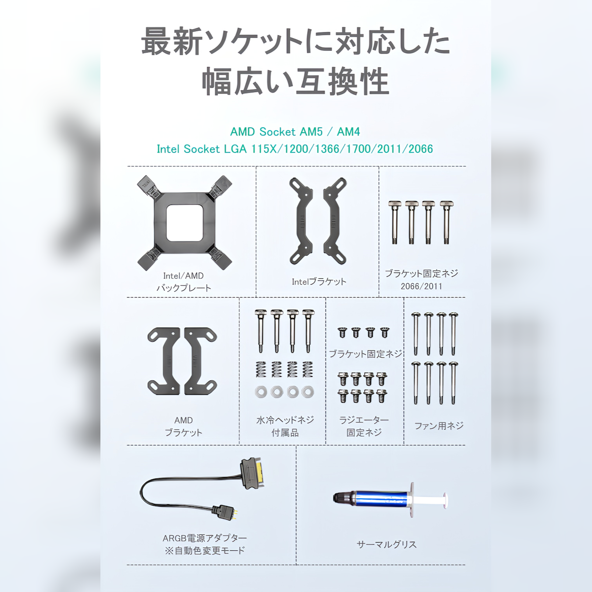 【互換性】Intel:LGA1700/1200/115X AMD:AM5/AM4ソケットに対応。MSI、Asrock、ASUS、Gigabyte様々なマザーボードのARGB 5v 3pinに対応