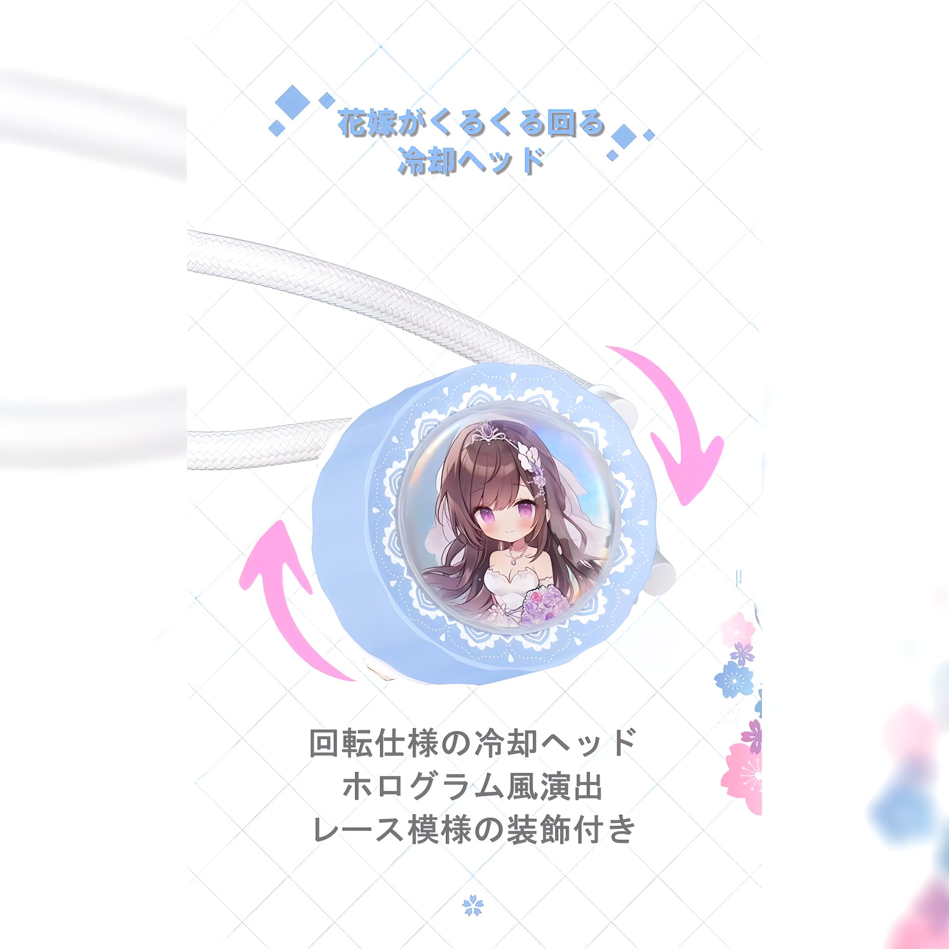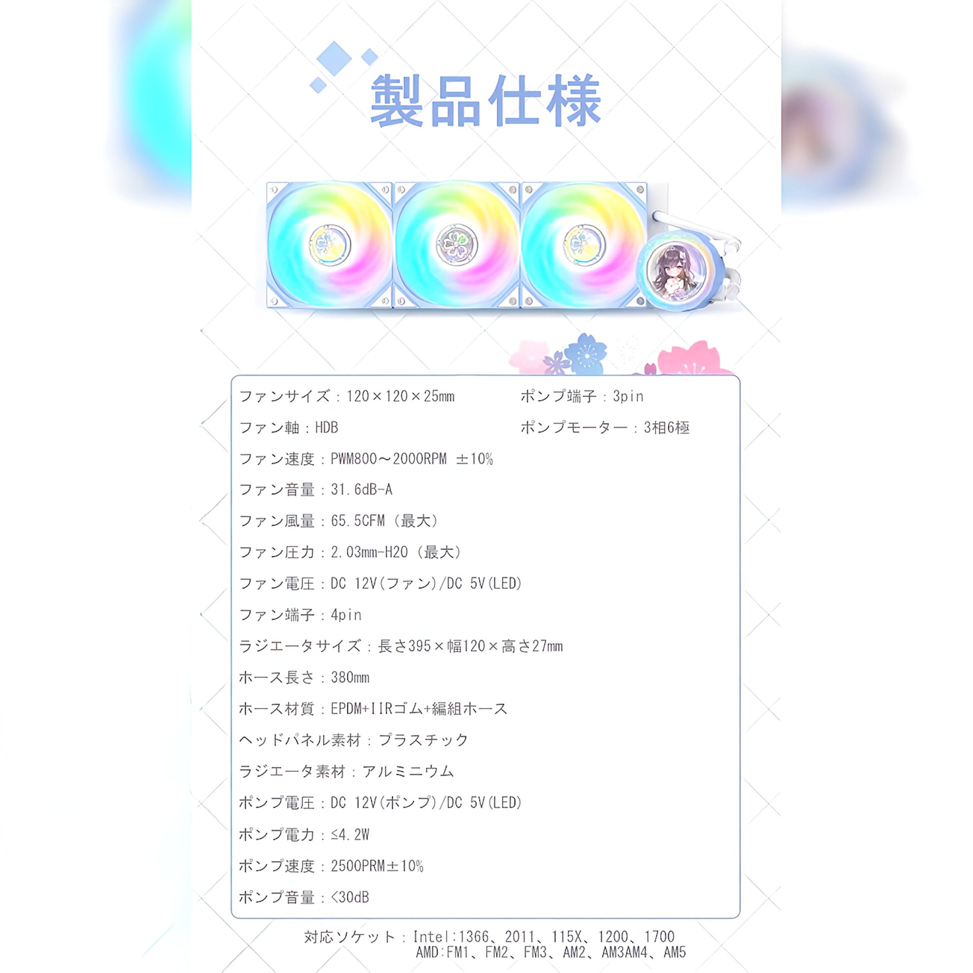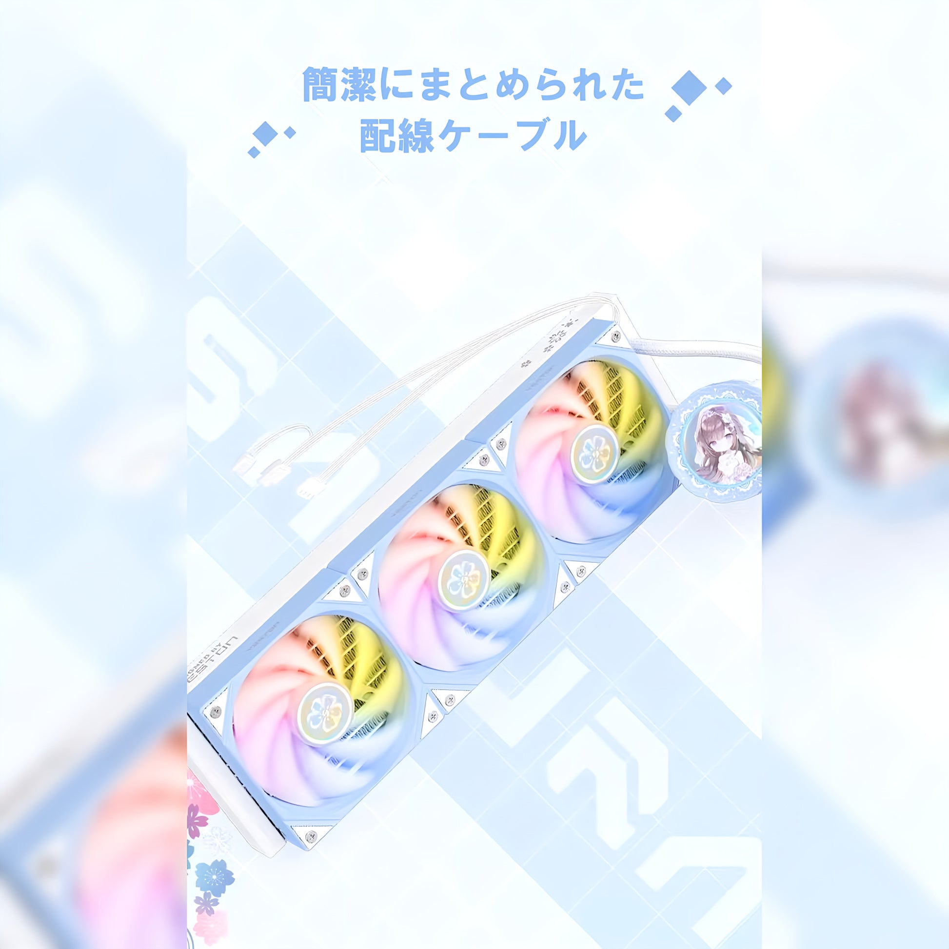 【特徴】水色とホワイトを基調とした爽やかなデザインが魅力の簡易水冷クーラーです。「嫁水冷」としても親しまれ、見た目にこだわるユーザーに最適です。360mmラジエーターによる高い冷却性能に加え、ARGB対応LEDで美しいライティング演出も楽しめます。