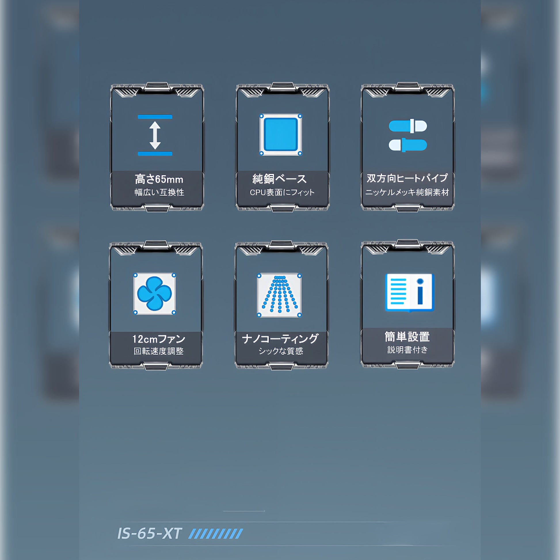 【特徴】高さ6.5cmとコンパクトな設計のトップフローCPUクーラーです。CPUベースが左右非対称なことからメモリスペースを確保し干渉しないように設置が可能です。ナノコーティングによりシックな質感があります。熱伝導率の高い純銅CPUベースとシームレスな4本のヒートパイプによりパワフルな冷却性能が特徴です。