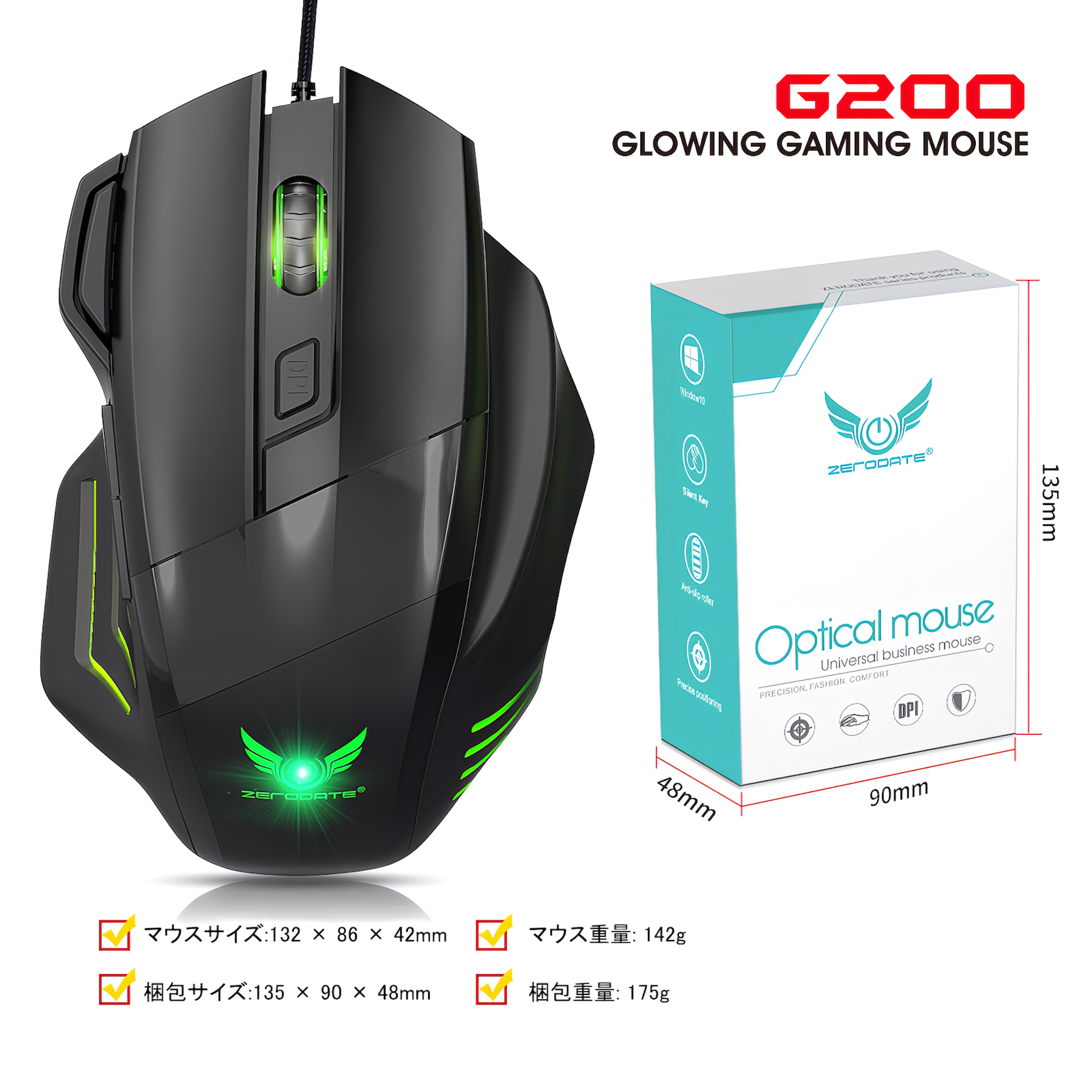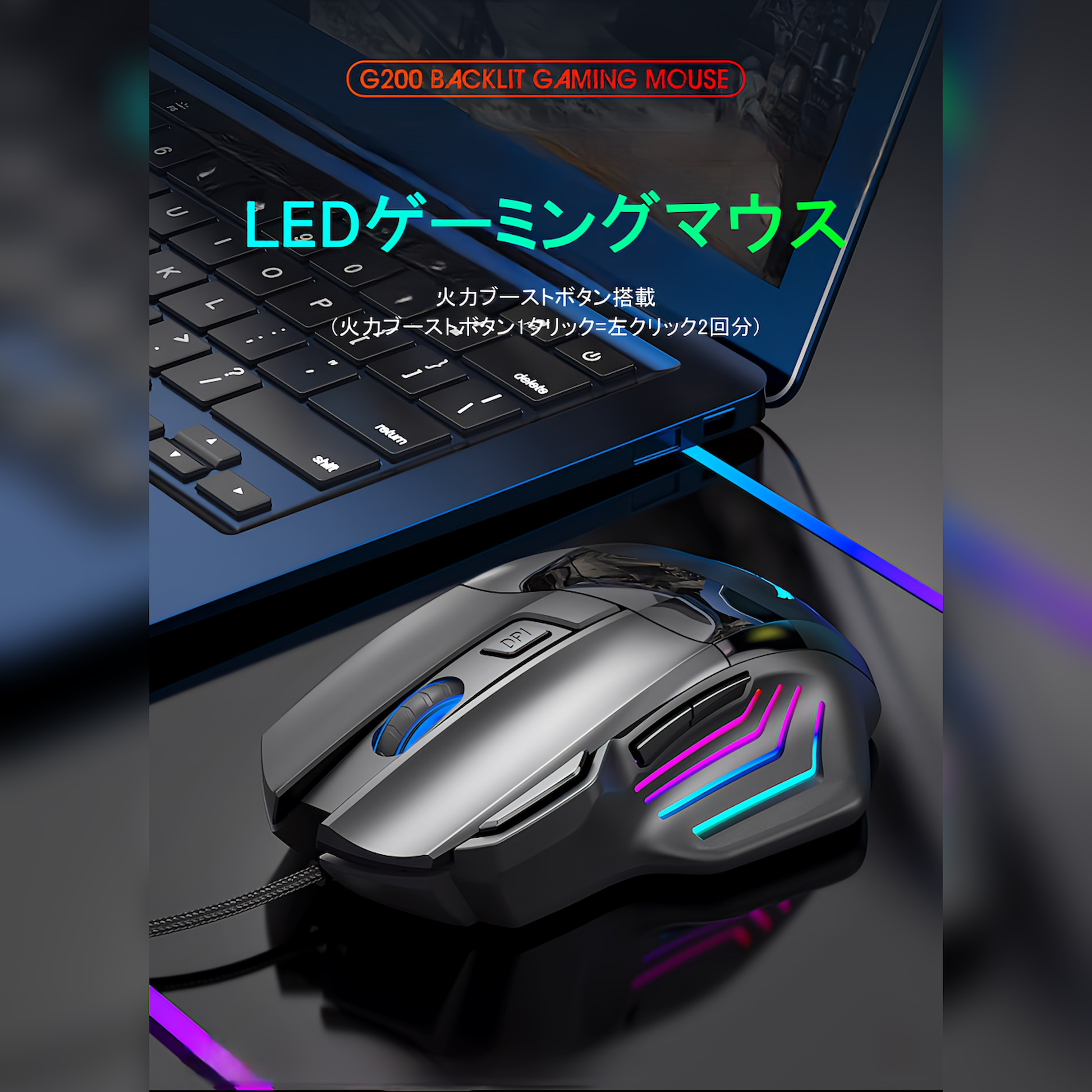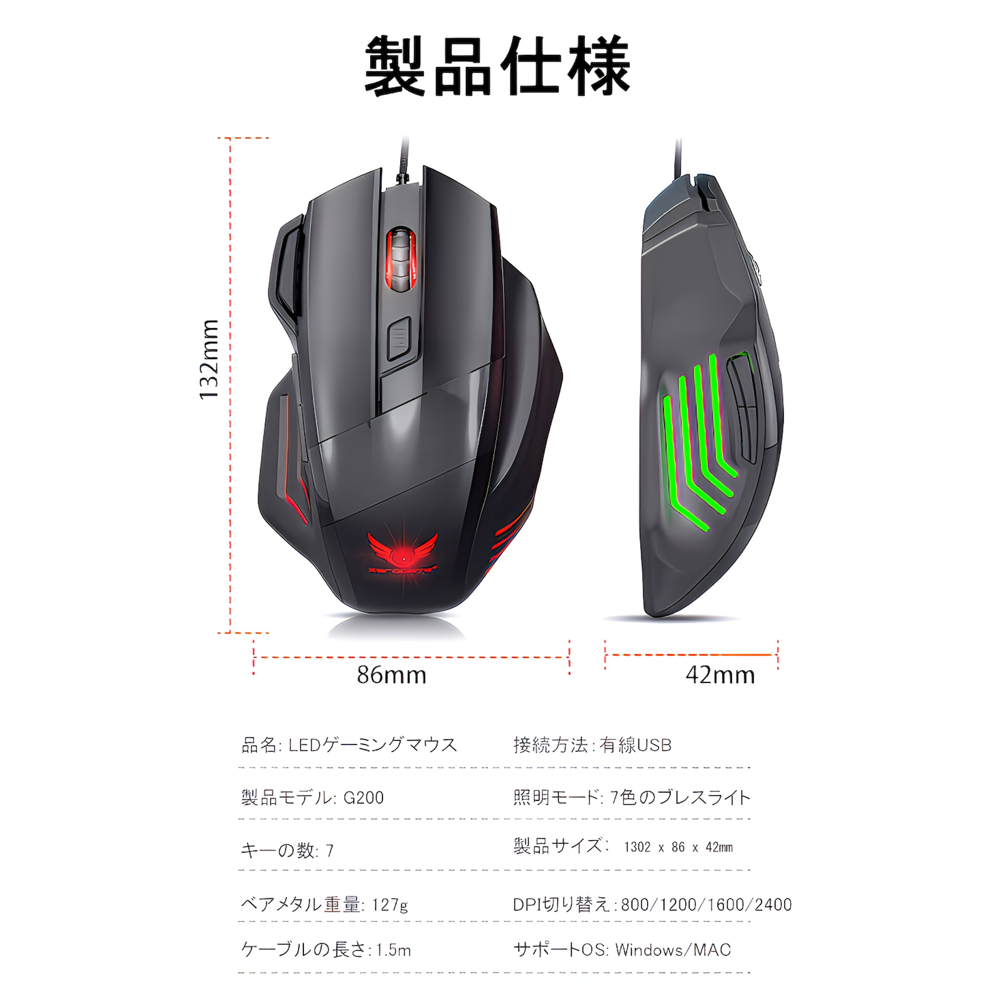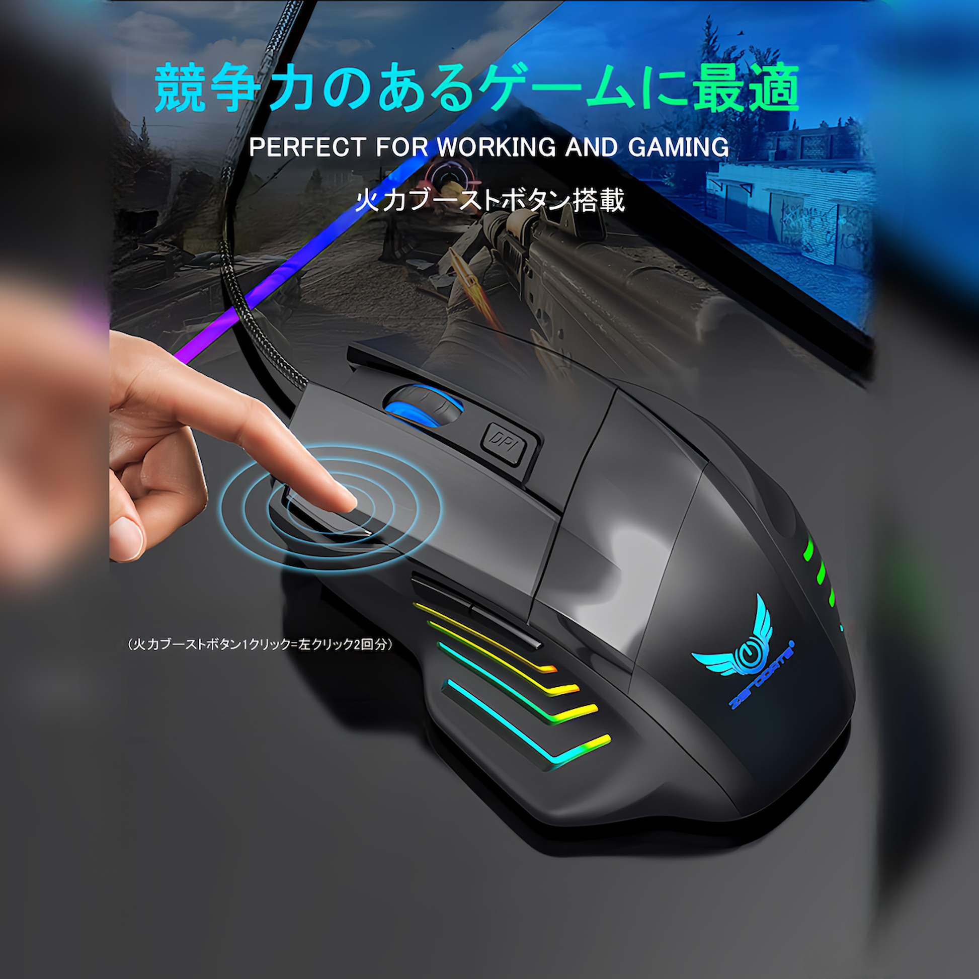 有線接続 LED ゲーミングマウス ボタン7個 ブラック 感度変更 1200dpi 1600dpi 2400dpi 3600dpi 進む戻るボタン付き