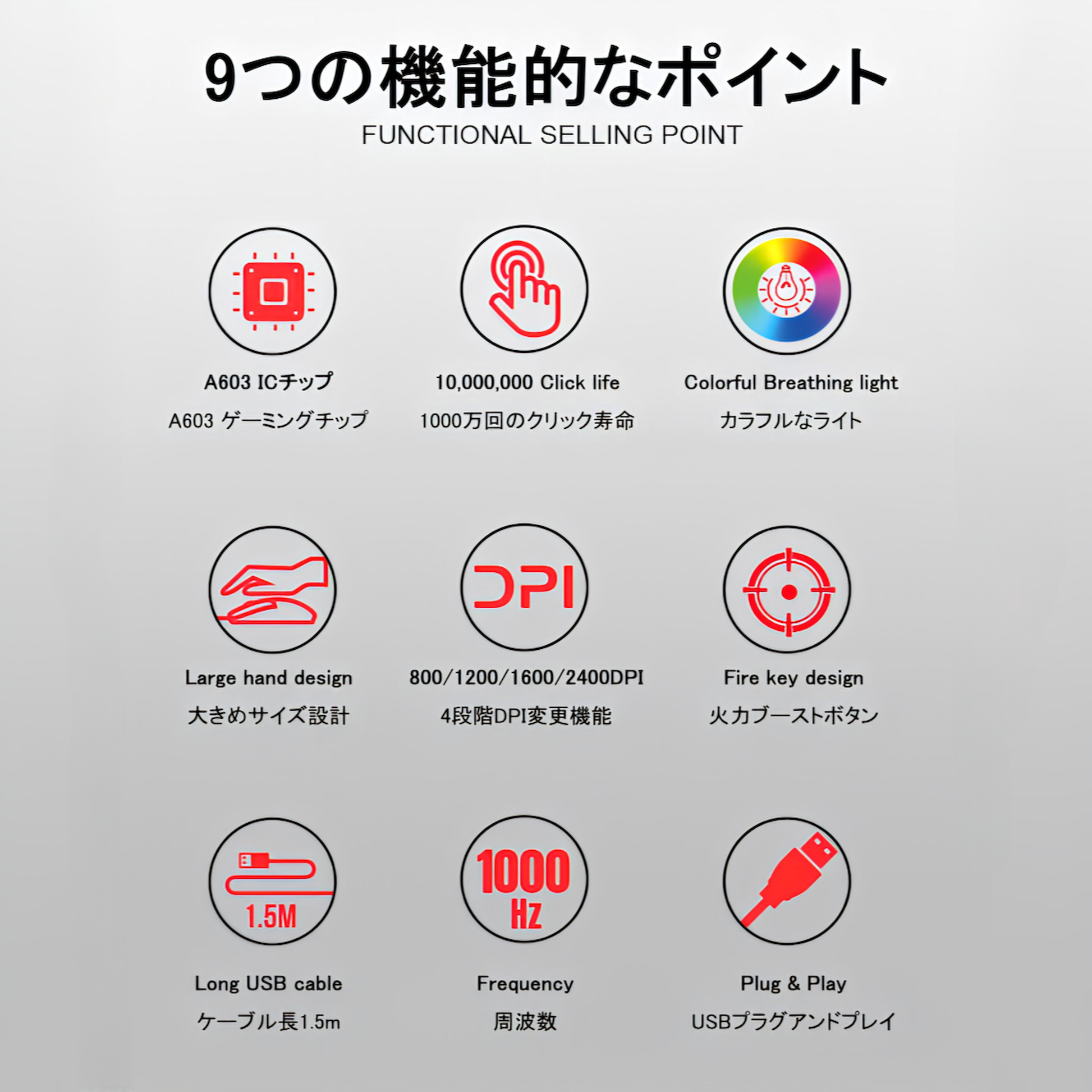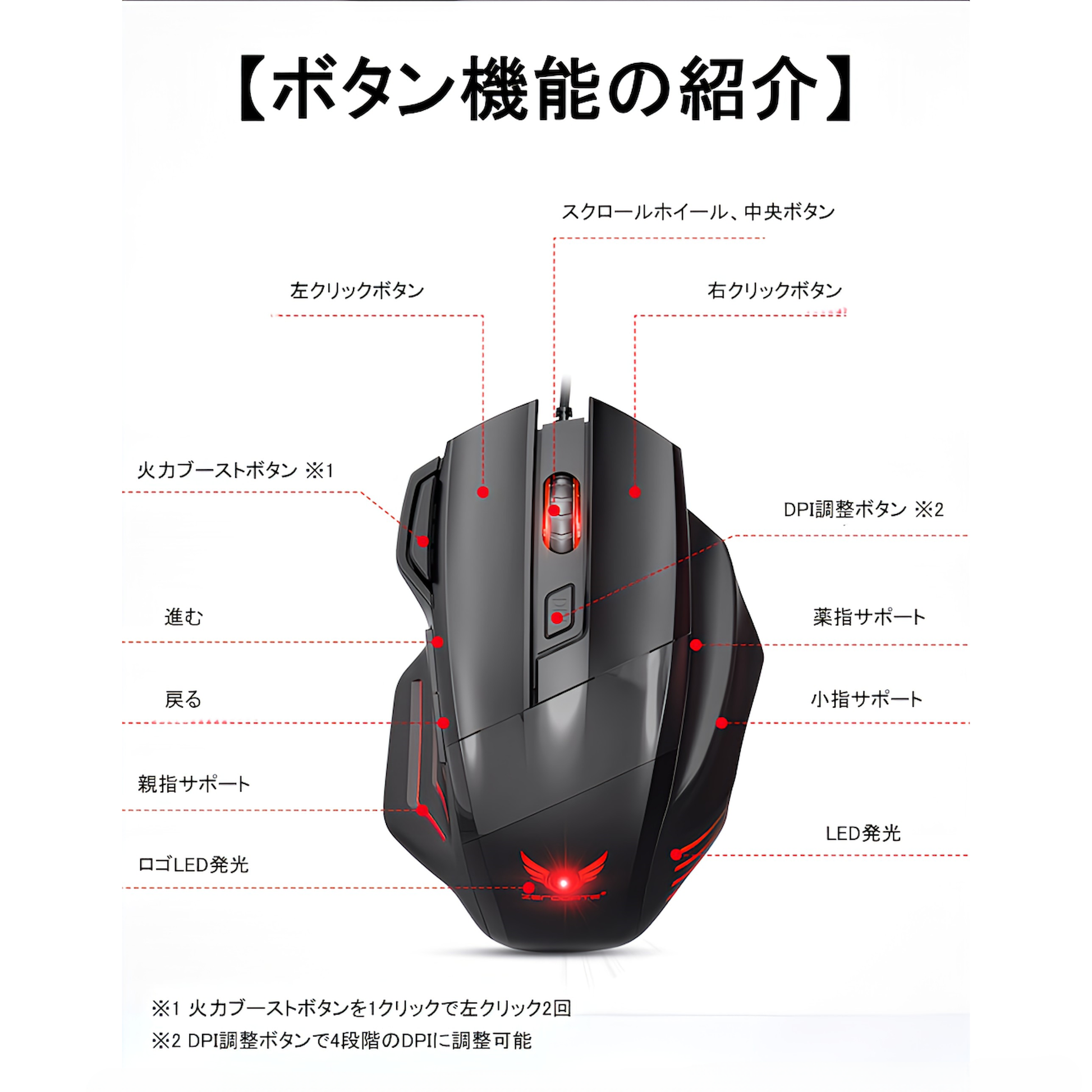 【快適な操作性】ワンボタンで 800/1200/1600/2400dpiの4段階調整可能な高感度センサー搭載。7つのボタンを搭載し、ゲームに応じて自由にカスタマイズ可能。