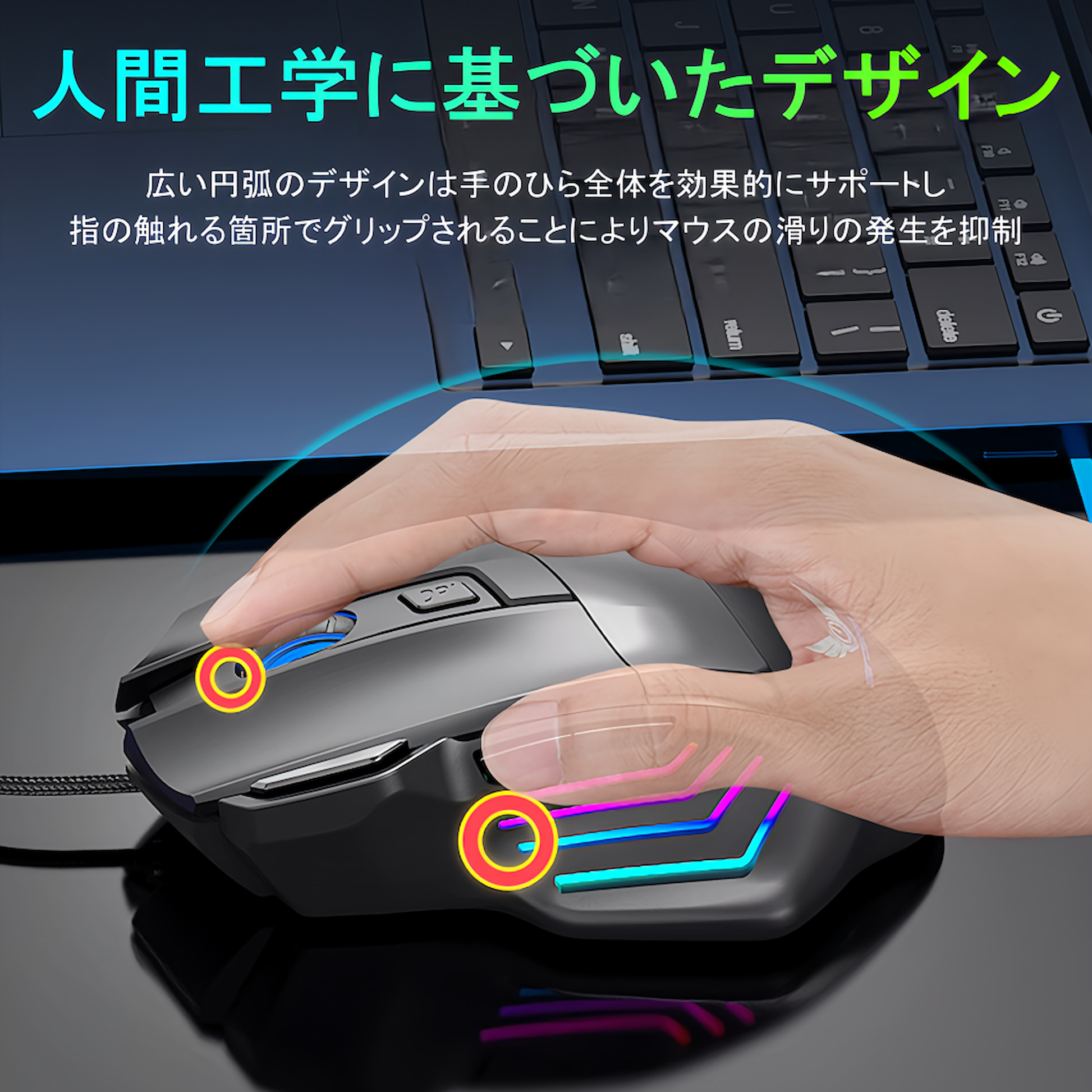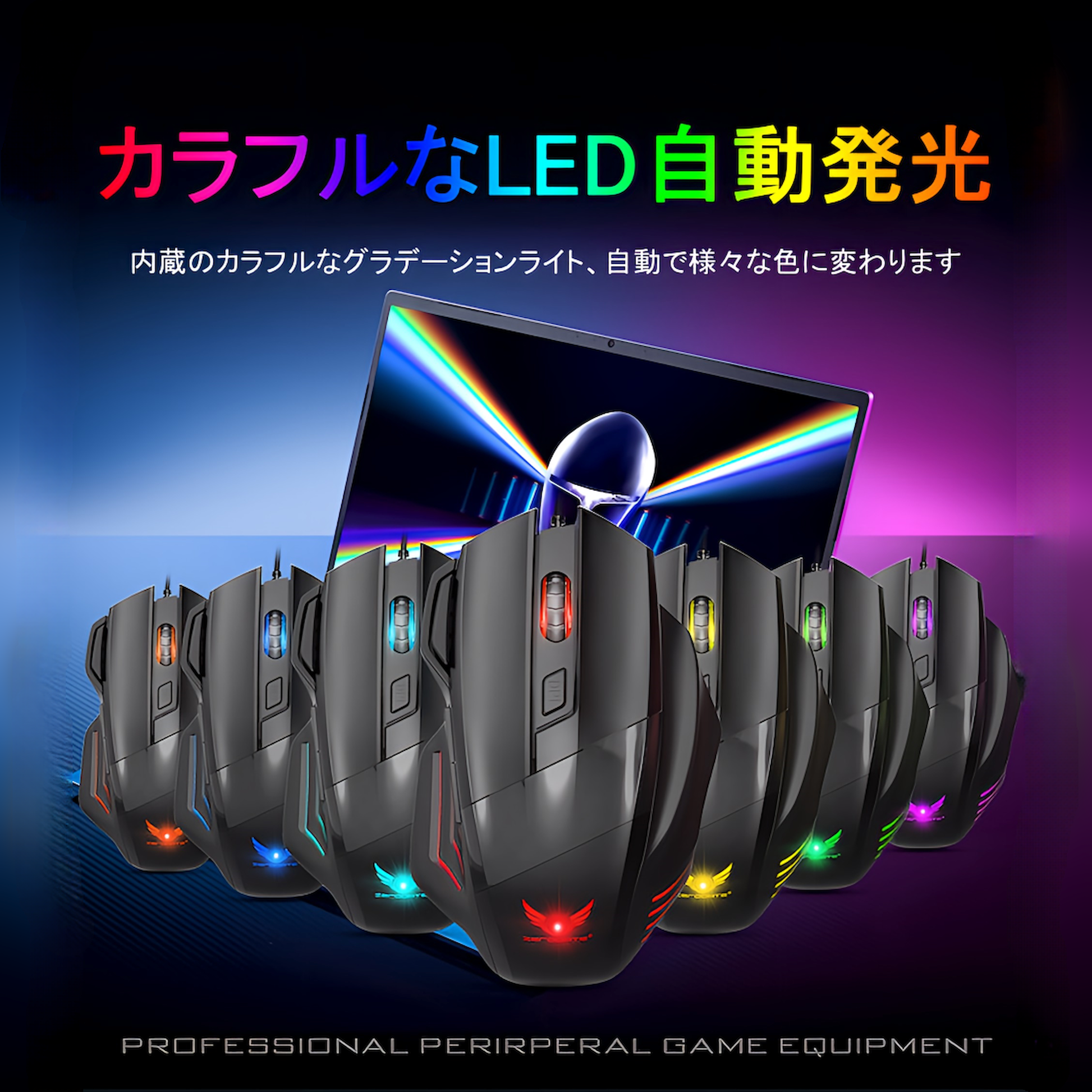 【カラフルなLED発光】内蔵のグラデーションライト、自動で様々な色に変わります。ゲーミングPCに相性の良いゲーミングマウスです。