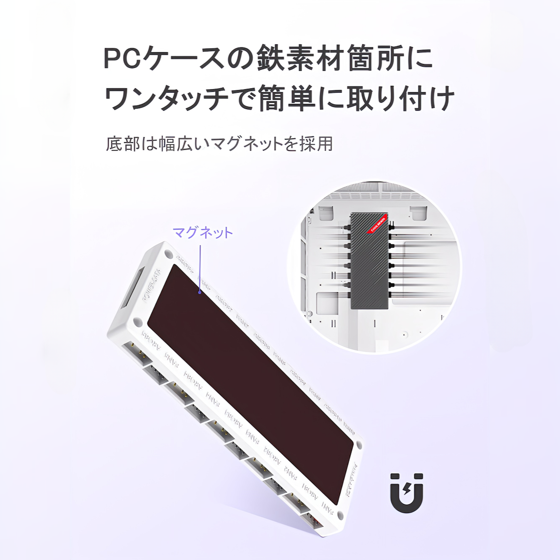 【簡単設置】マグネットで取り付け可能なため、マザーボードの5V ARGB/12V RGBヘッダーとSATAケーブルに接続するだけで、すぐに利用できます。