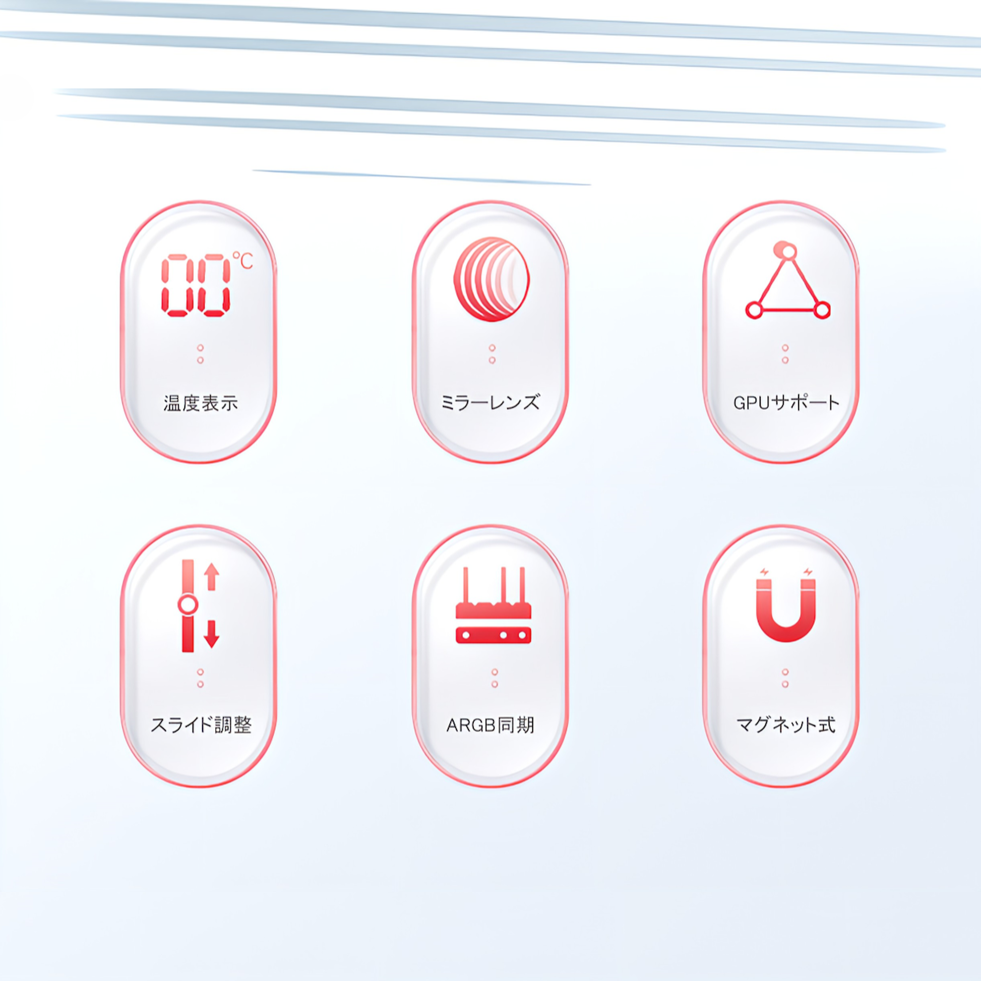 【特徴】PCケース内の温度表示機能でケースファンの回転数を適切にすることができます。グラフィックボードを支持することでマザーボードに掛かる負担を軽減し、PCを長くご使用することができます。コンパクトな設計でスペースを取らずどこにでも設置できるのが特徴です。