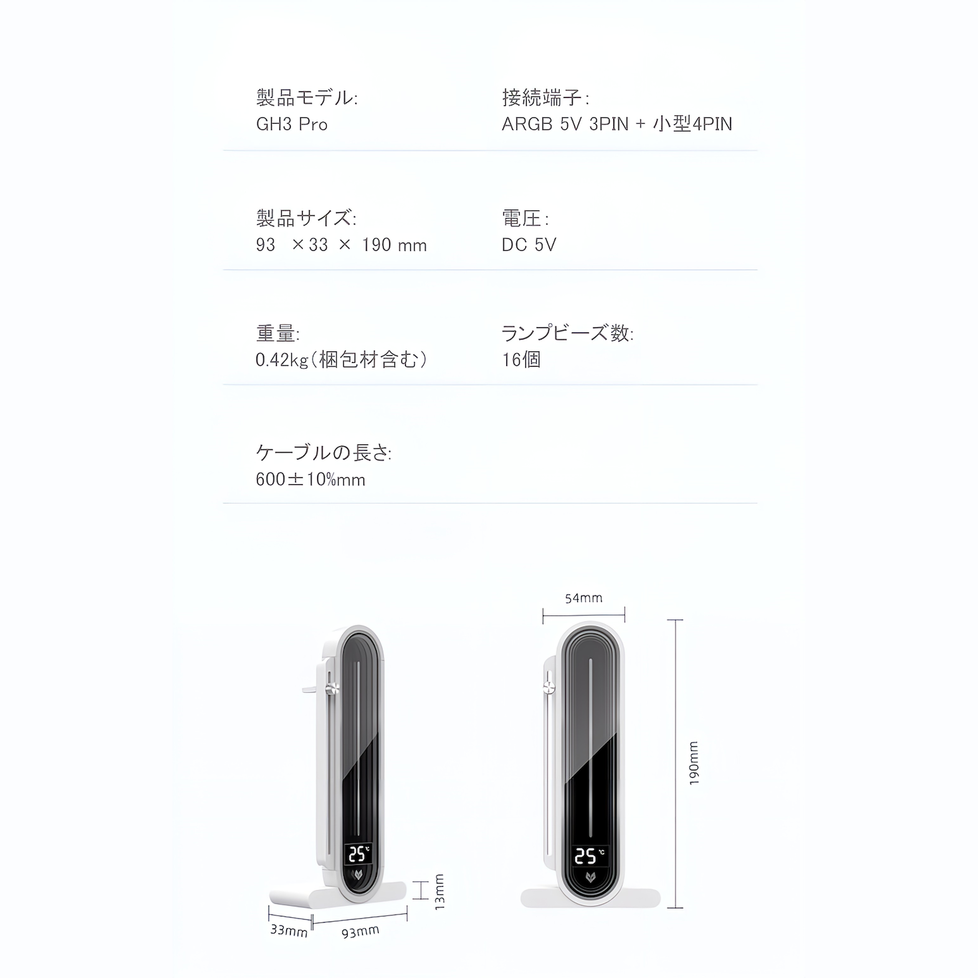 【機能】PCケース内の温度表示、グラフィックボードの垂れを防ぐ支持機能。ARGB 5v 3pinでLED制御機能。
