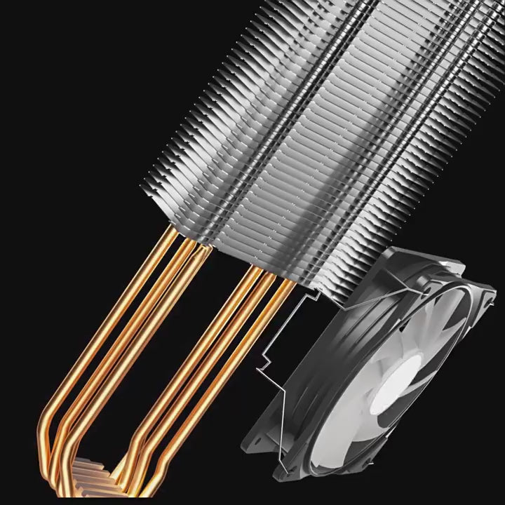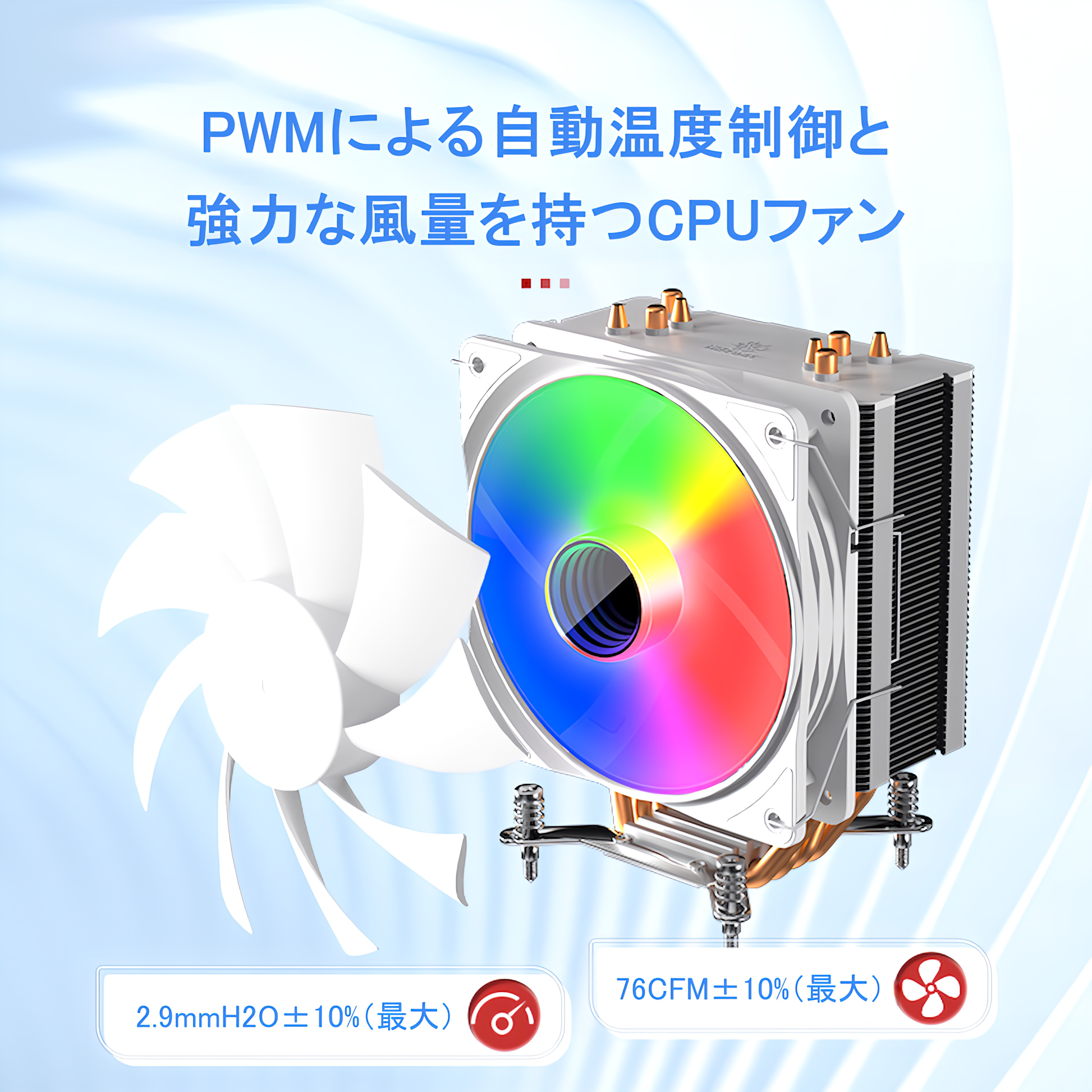 【機能】強力な冷却性能を誇り、長時間の高負荷動作でもCPUの温度を安定的にコントロール。4本の高効率ヒートパイプを搭載し、熱を素早く拡散。さらに、PWM回転制御機能により、負荷に応じてファンの回転速度を自動調整し、静音性と冷却効率を両立。快適なゲームプレイをサポートします。