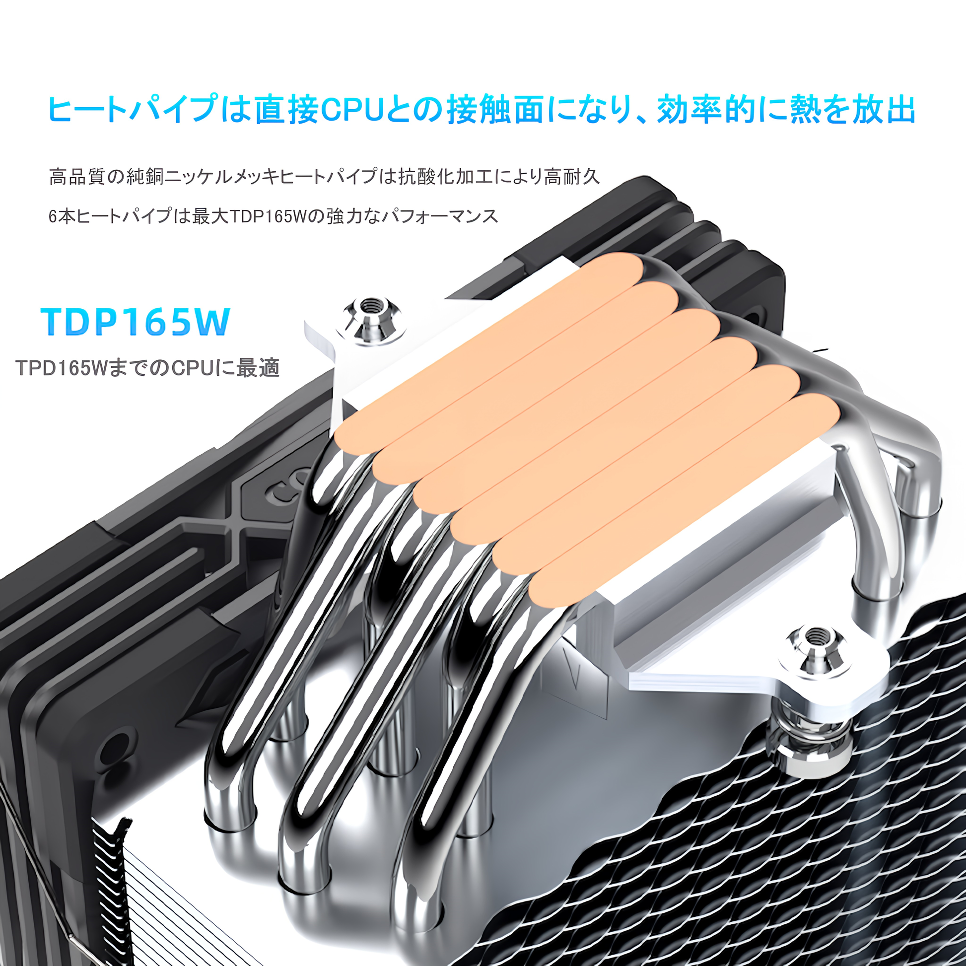 【機能】6本の高性能ヒートパイプと120mmファンを搭載し、強力な空冷性能でCPUの温度を効率的に管理。ARGB 5V 3pin制御に対応し、5V 3pin対応マザーボードやARGBコントローラーを使用して自由にライティングを変更できます。PWM制御により、静音性と冷却性能を自動調整し、最適な動作環境を提供します。