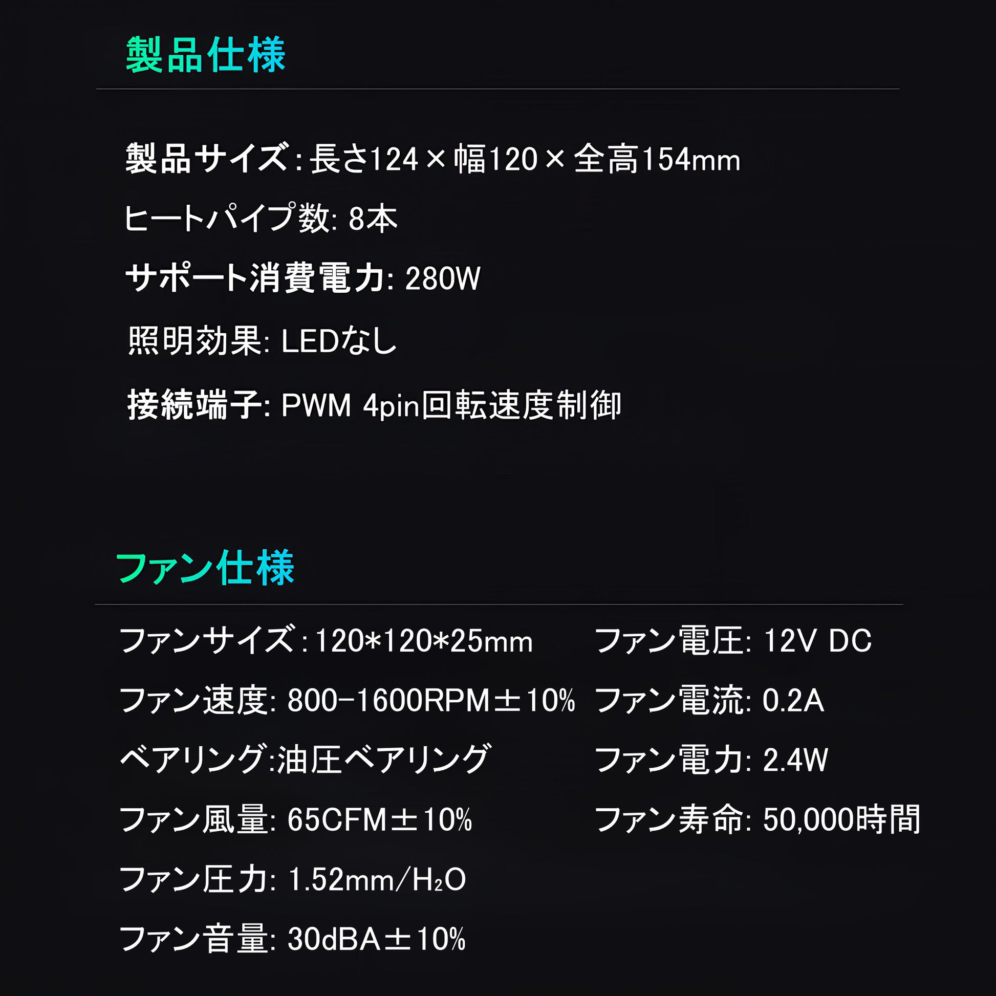 【機能】PWM対応の薄型120mmファンを採用し、800~1600RPMで自動制御されます。最大65CFMの風量と30dBAの静音性を両立。ヒートパイプ内部は冷却液と毛細管構造を最適配置し、縦置き・横置きどちらのケースでも高い冷却効果を発揮します。メモリを避けるヒートパイプオフセット設計で取り付けもスムーズです。