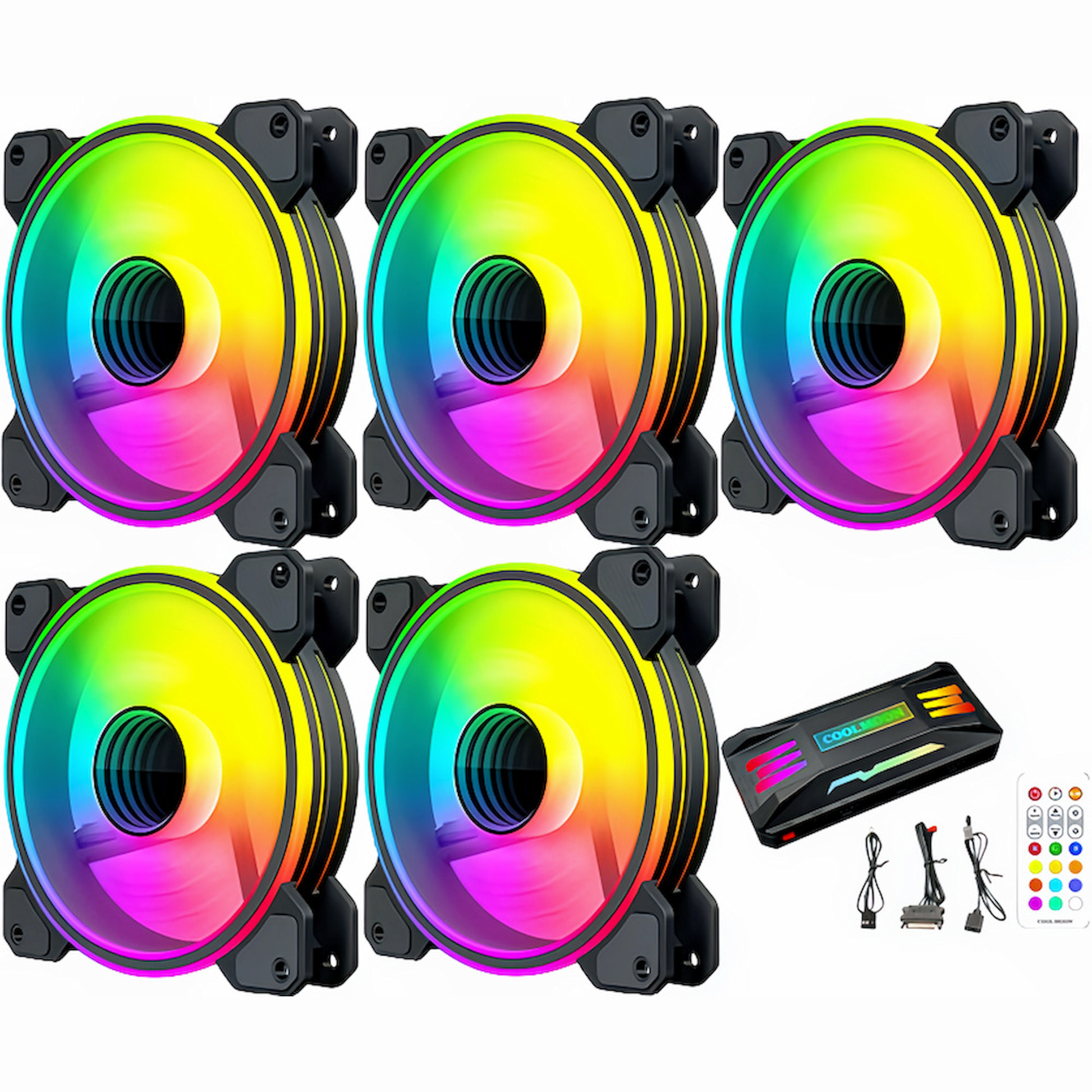 COOLMOON PCケースファン5枚セット 120mm 4pin PWM LED ARGB 5v 3pin ファンハブ コントローラー付き リモコン 色変更可能 ファン回転速度変更可能 インフィニティ―ミラー (ファンコントローラー+ファン5枚セット)ブラック