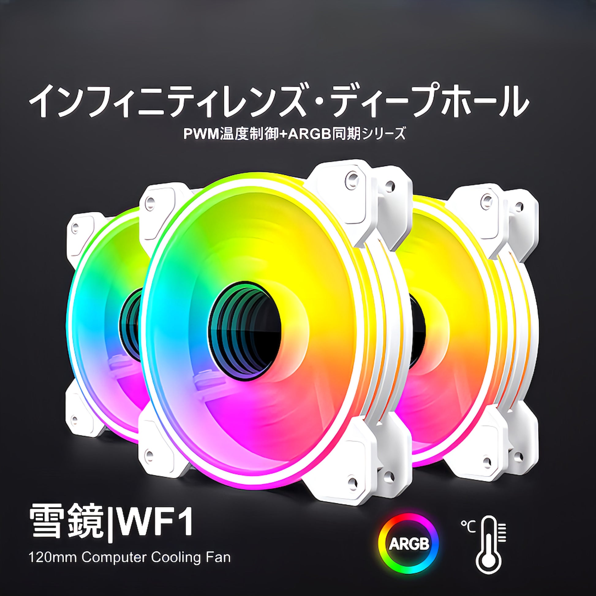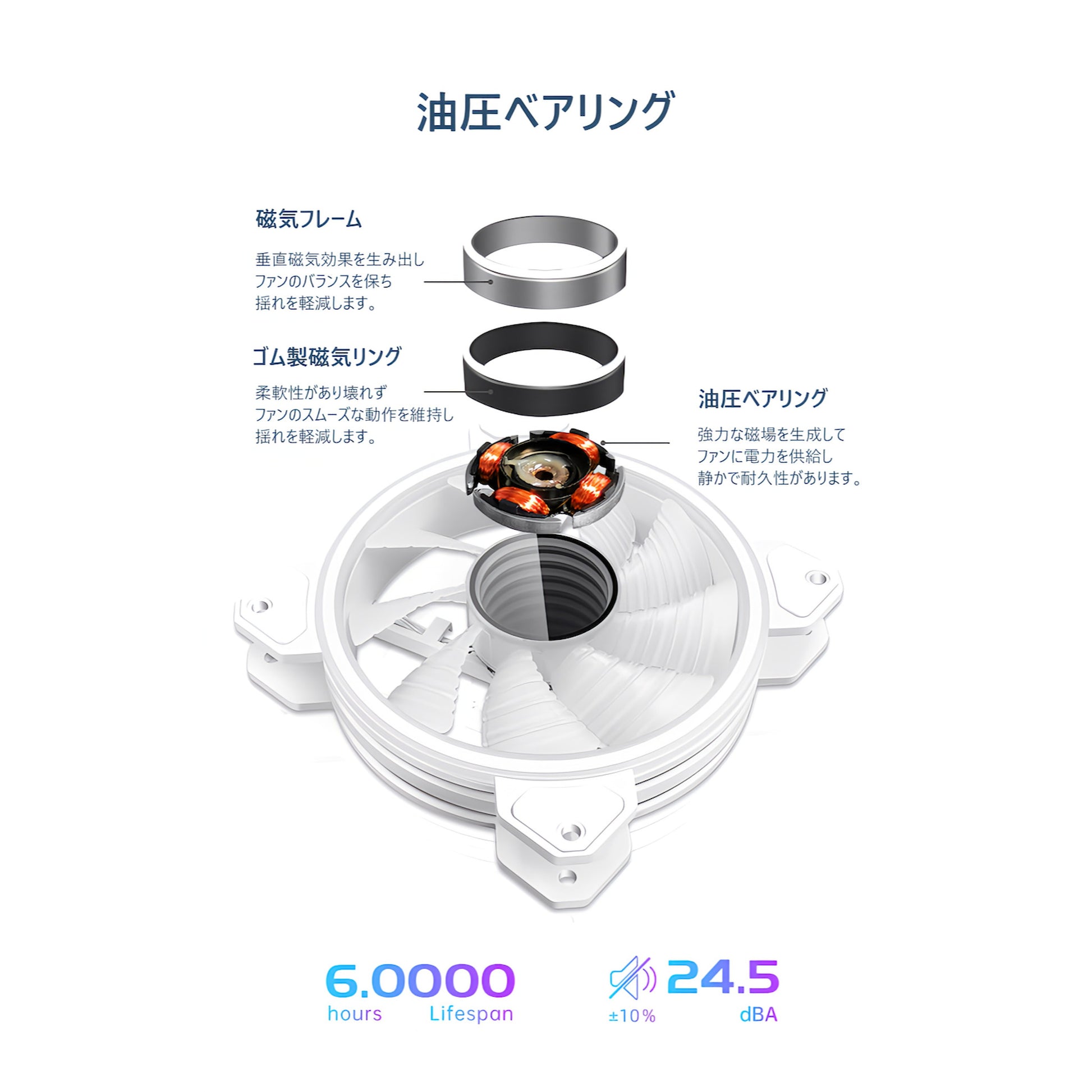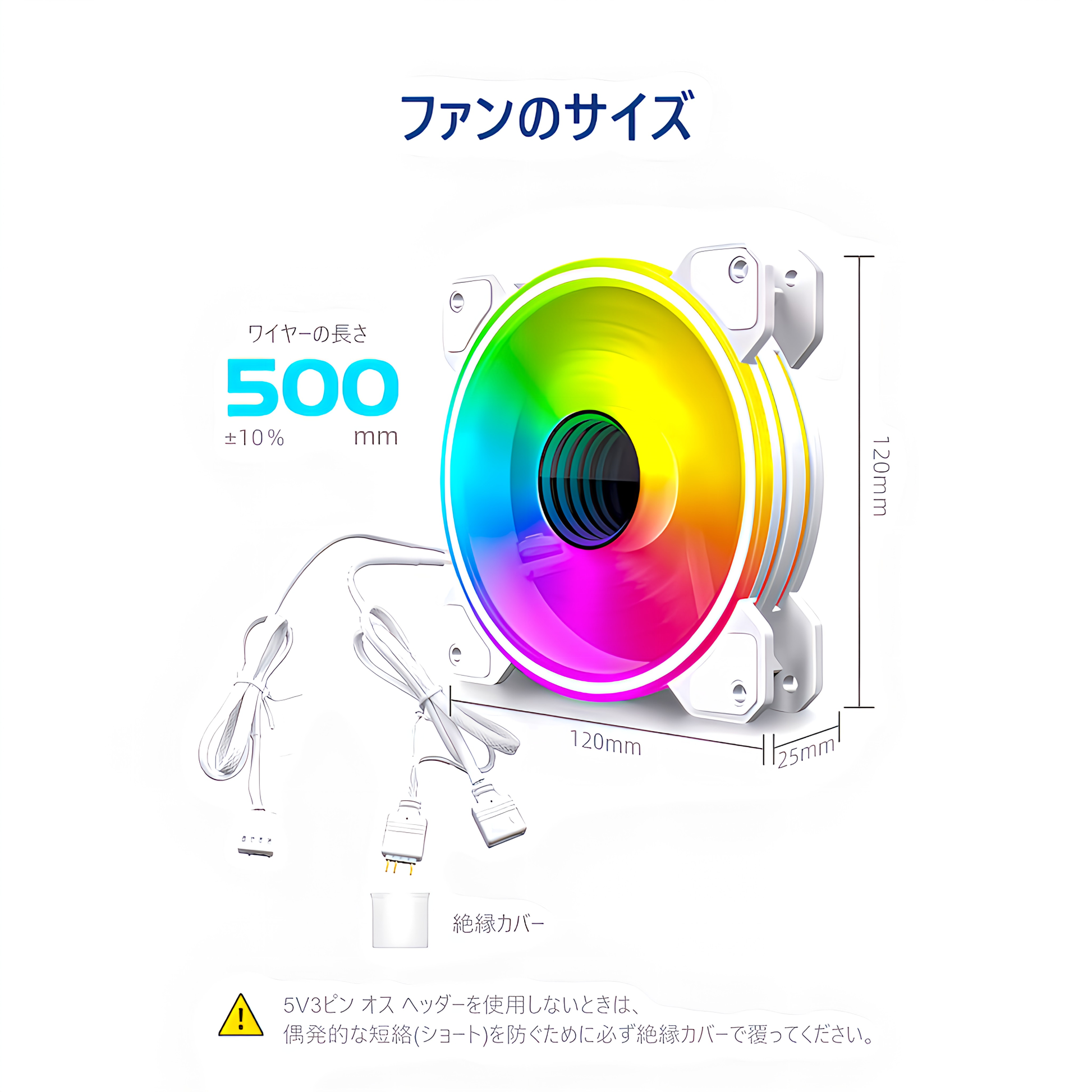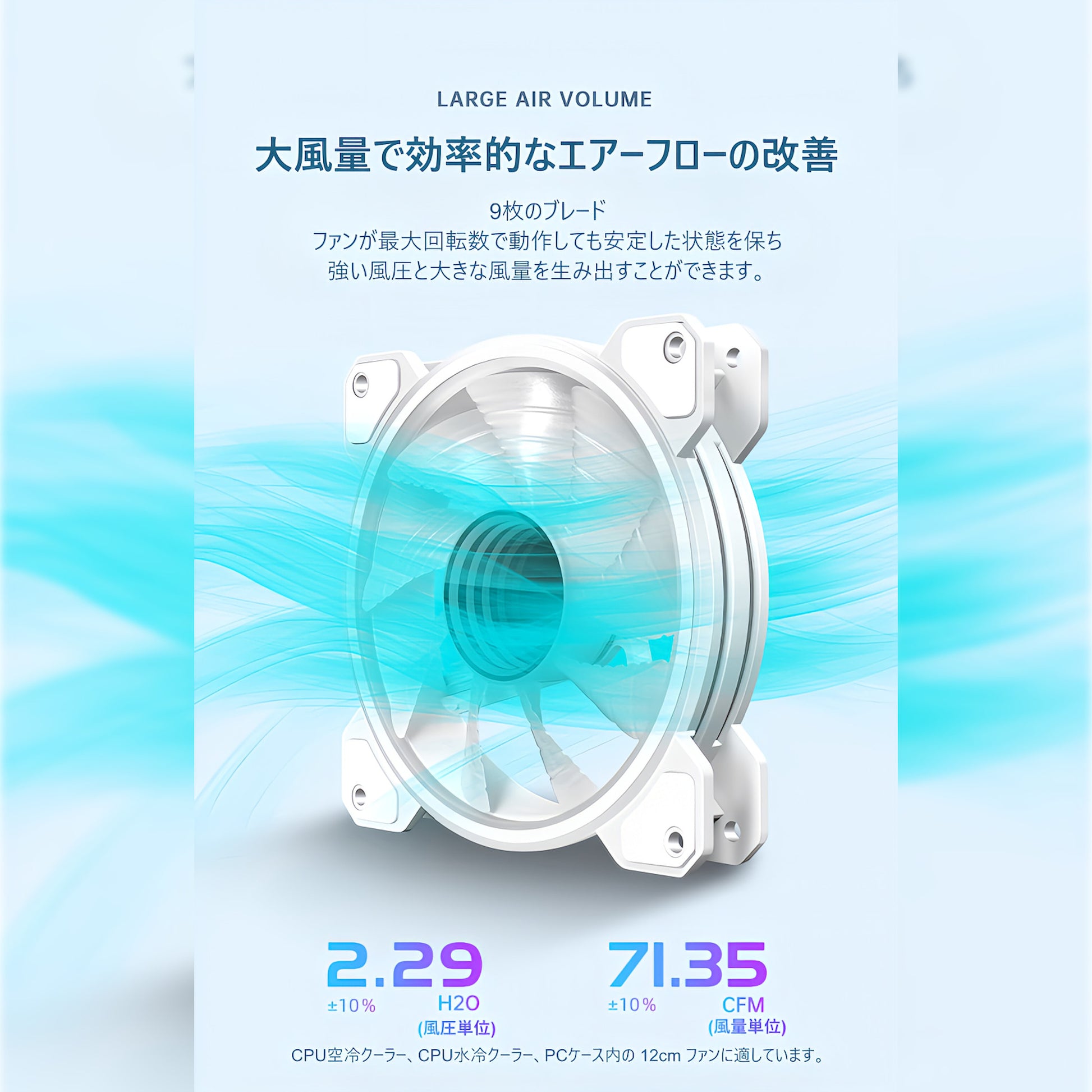 【機能】PCのエアーフロー改善、冷却機能 。ARGB 5v 3pinで制御が可能です。5v 3pin対応のマザーボードやARGBコントローラーで色の変更ができます。