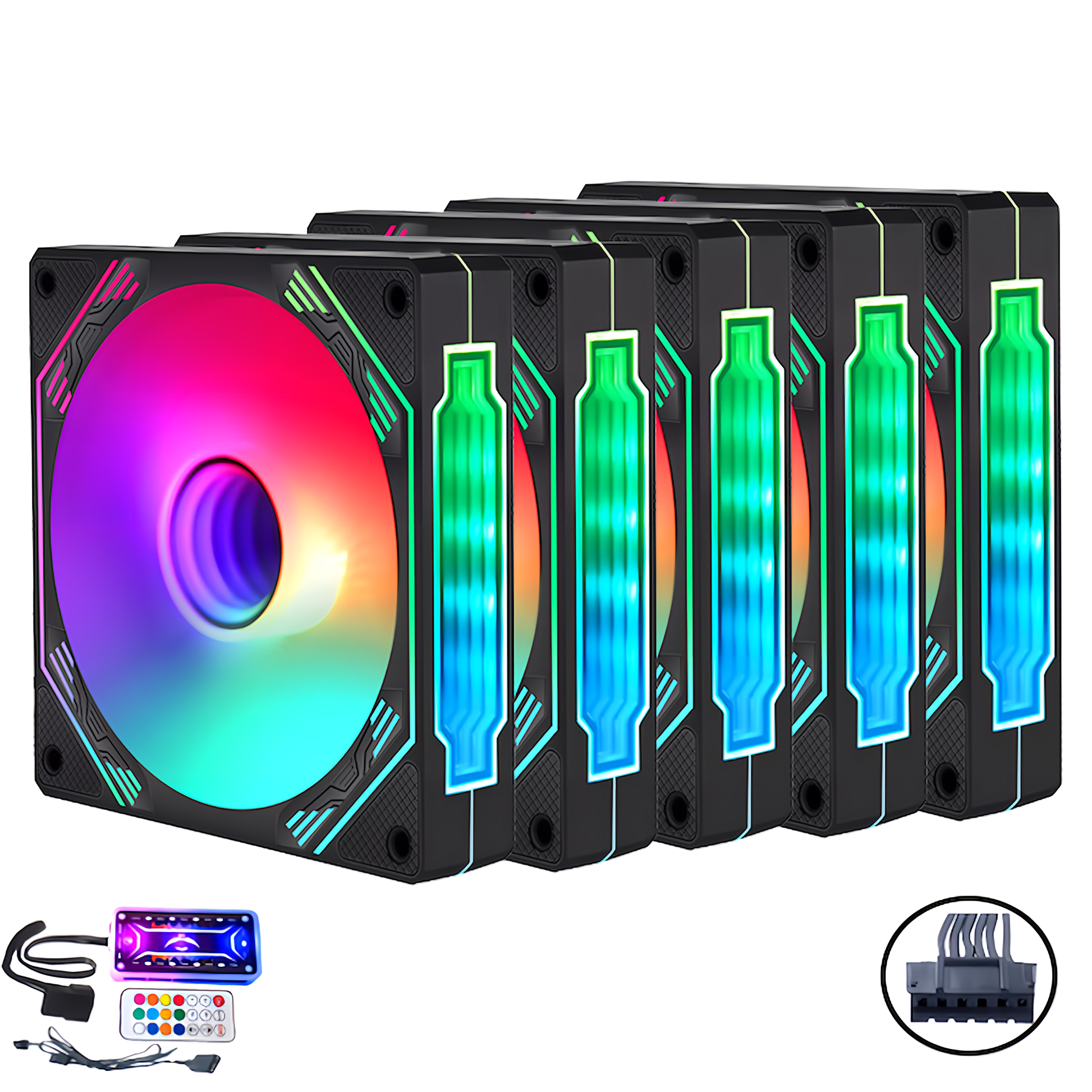 インフィニティ―ミラー PCケースファン5枚セット 120mm LED ARGB 6pin ハブ コントローラー付き リモコン 色変更可能 ファン回転速度変更可能 ペリフェラル電源 (コントローラー+5枚セット) ブラック