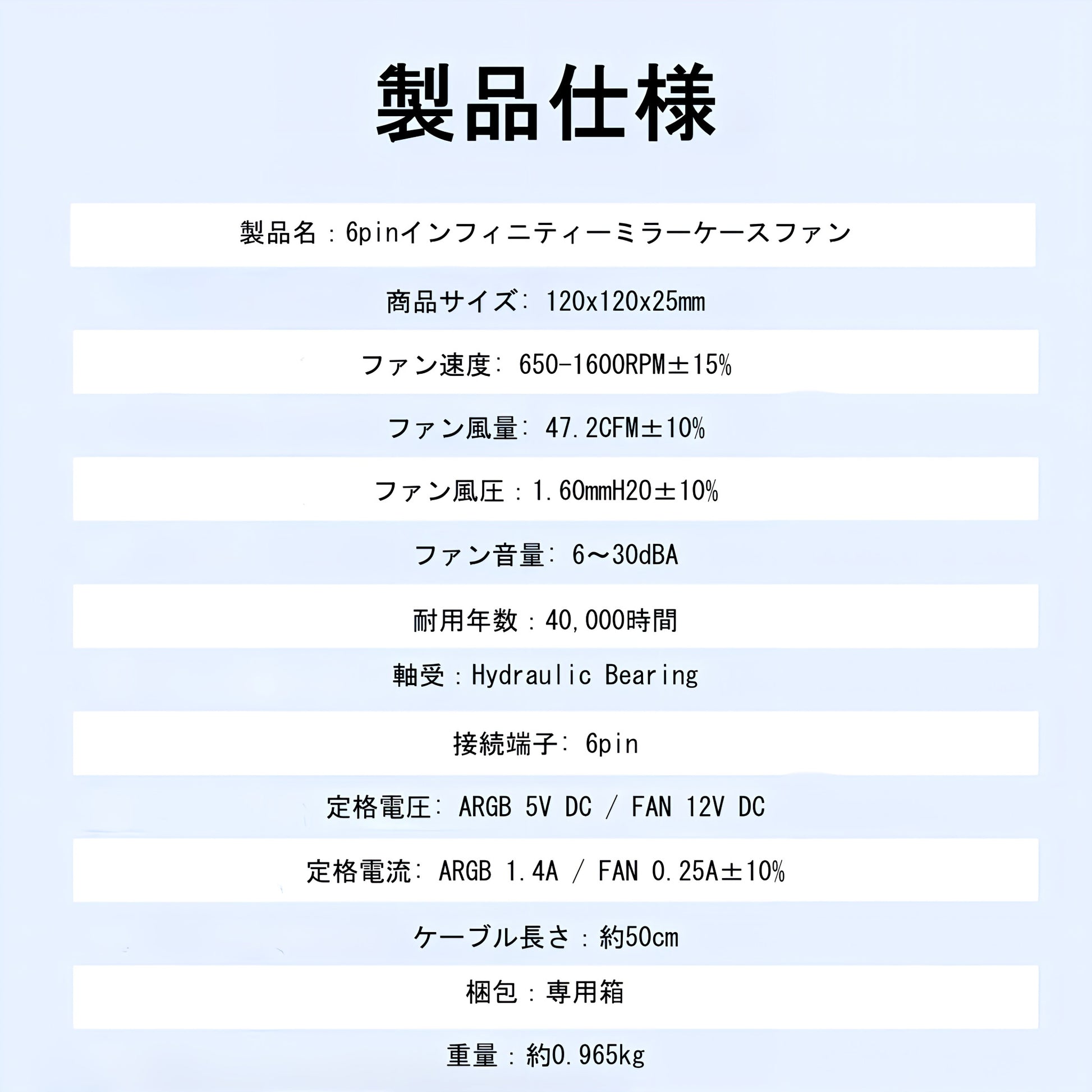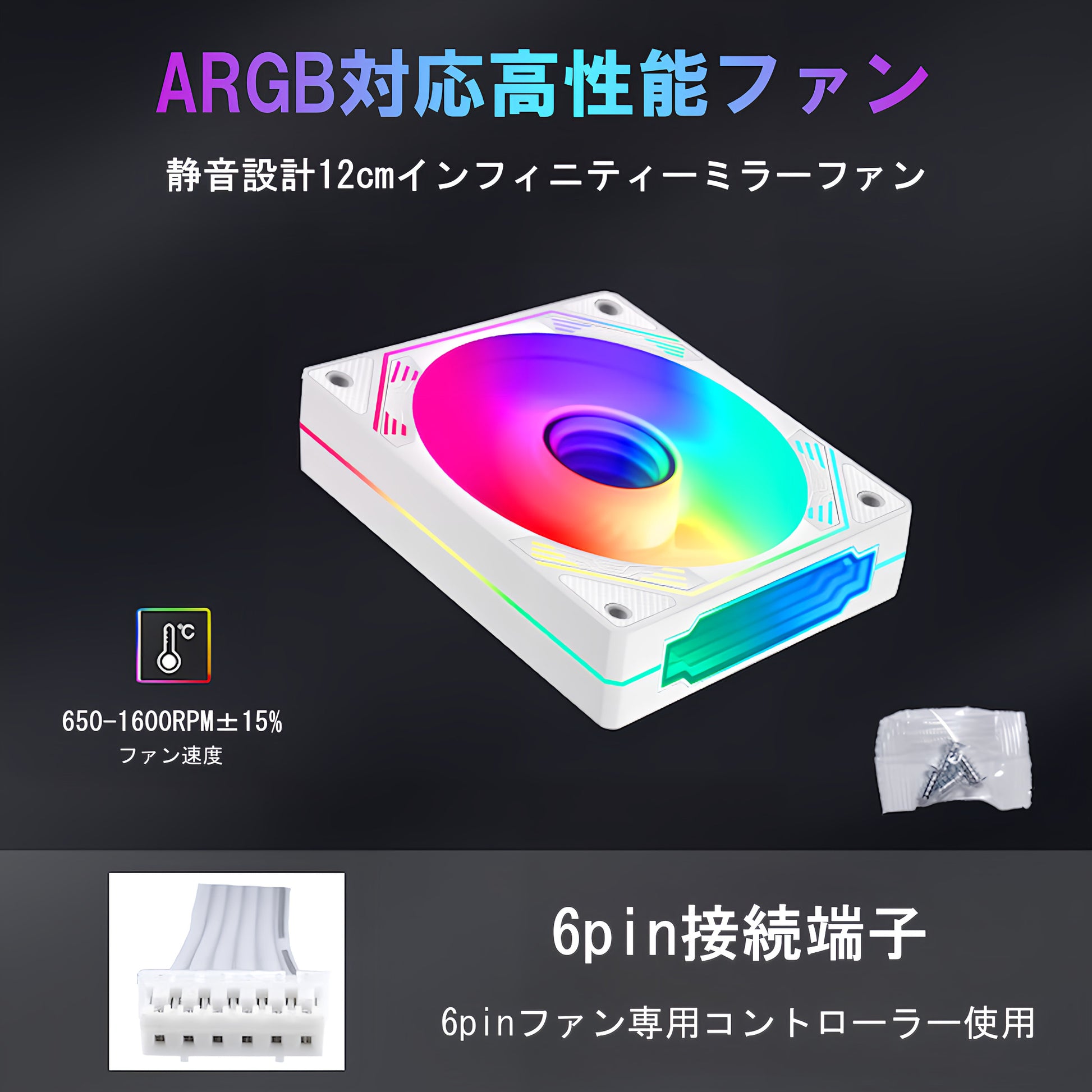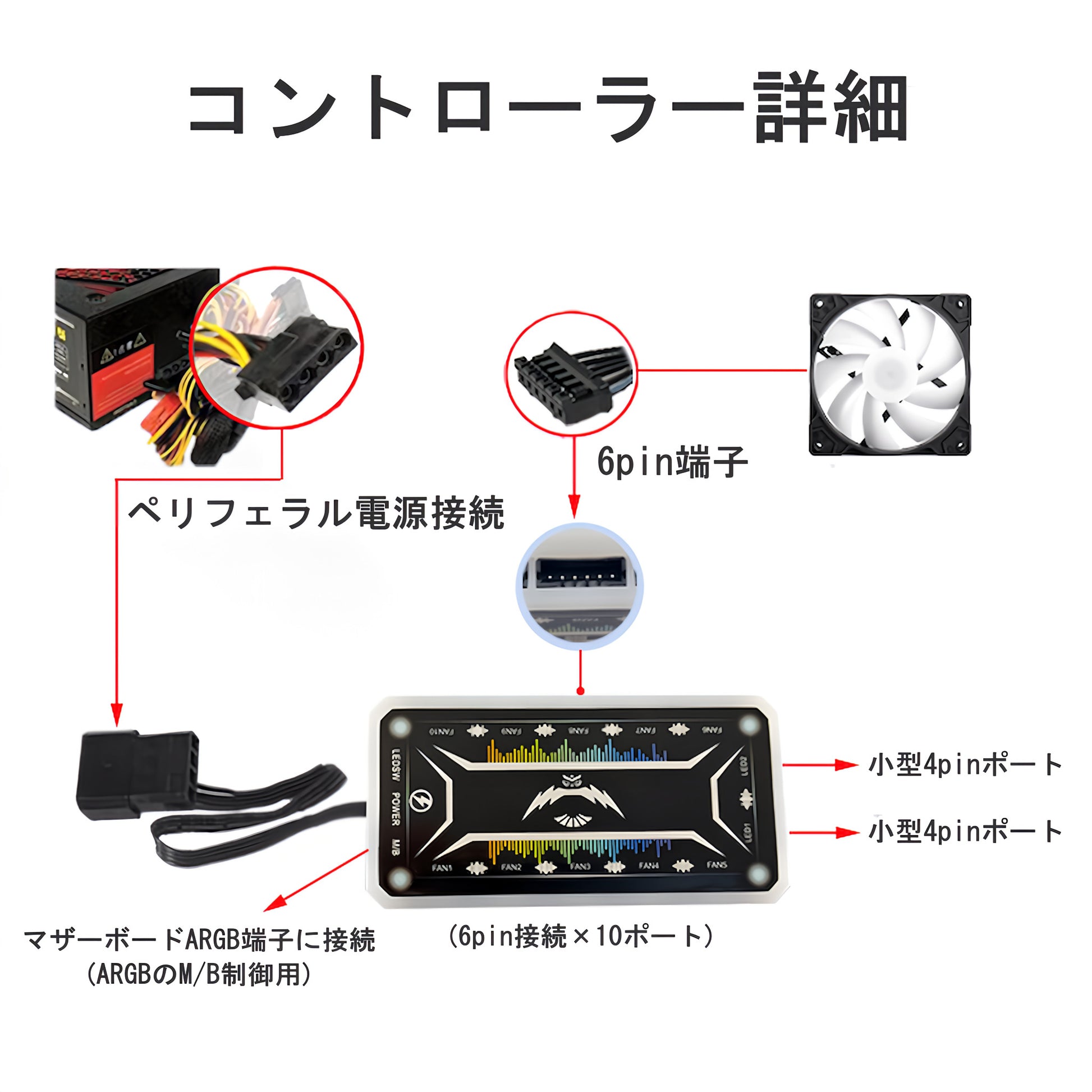 【互換性】ペリフェラル電源に対応。120mm取り付け可能なPCケースに対応。6pin制御のパーツに対応。