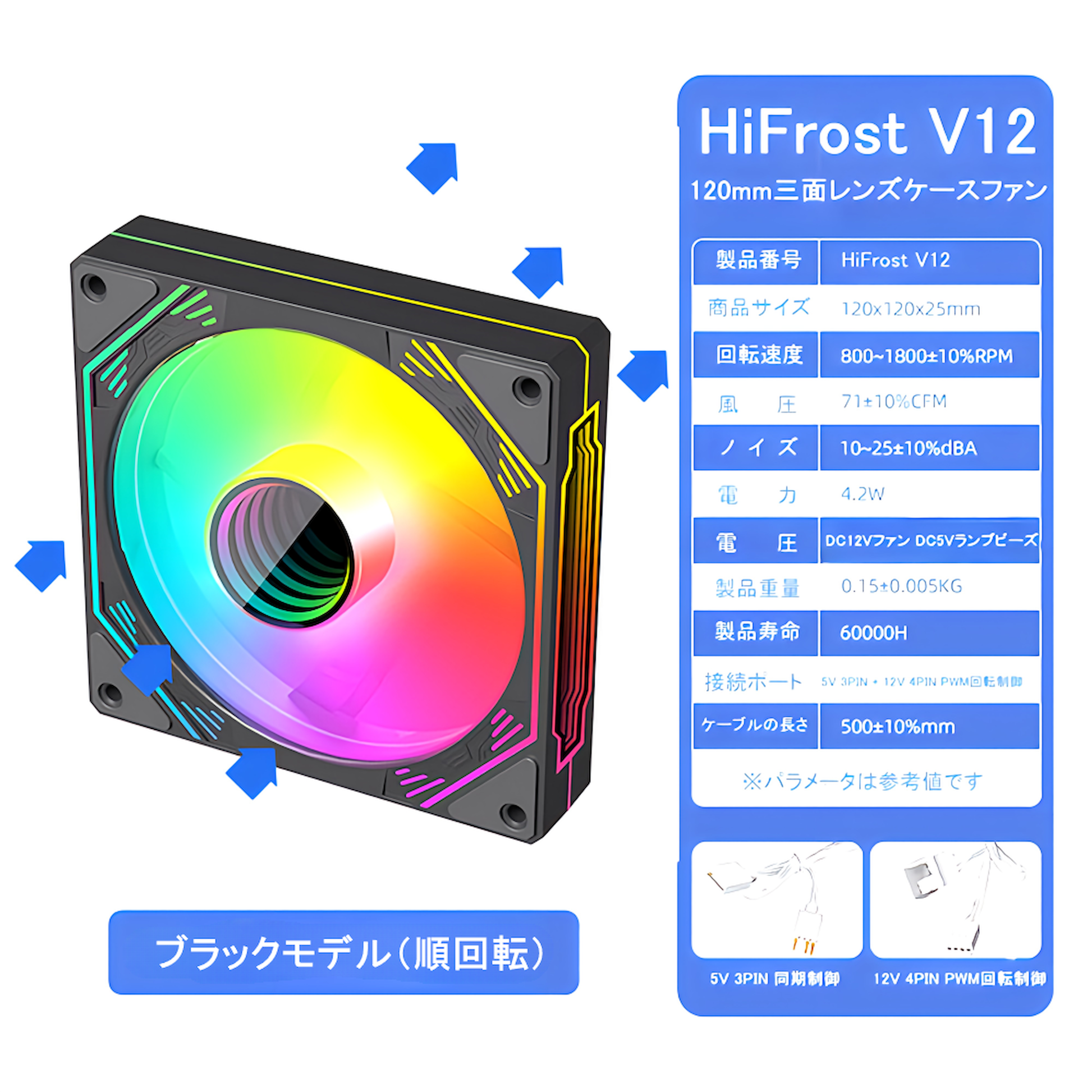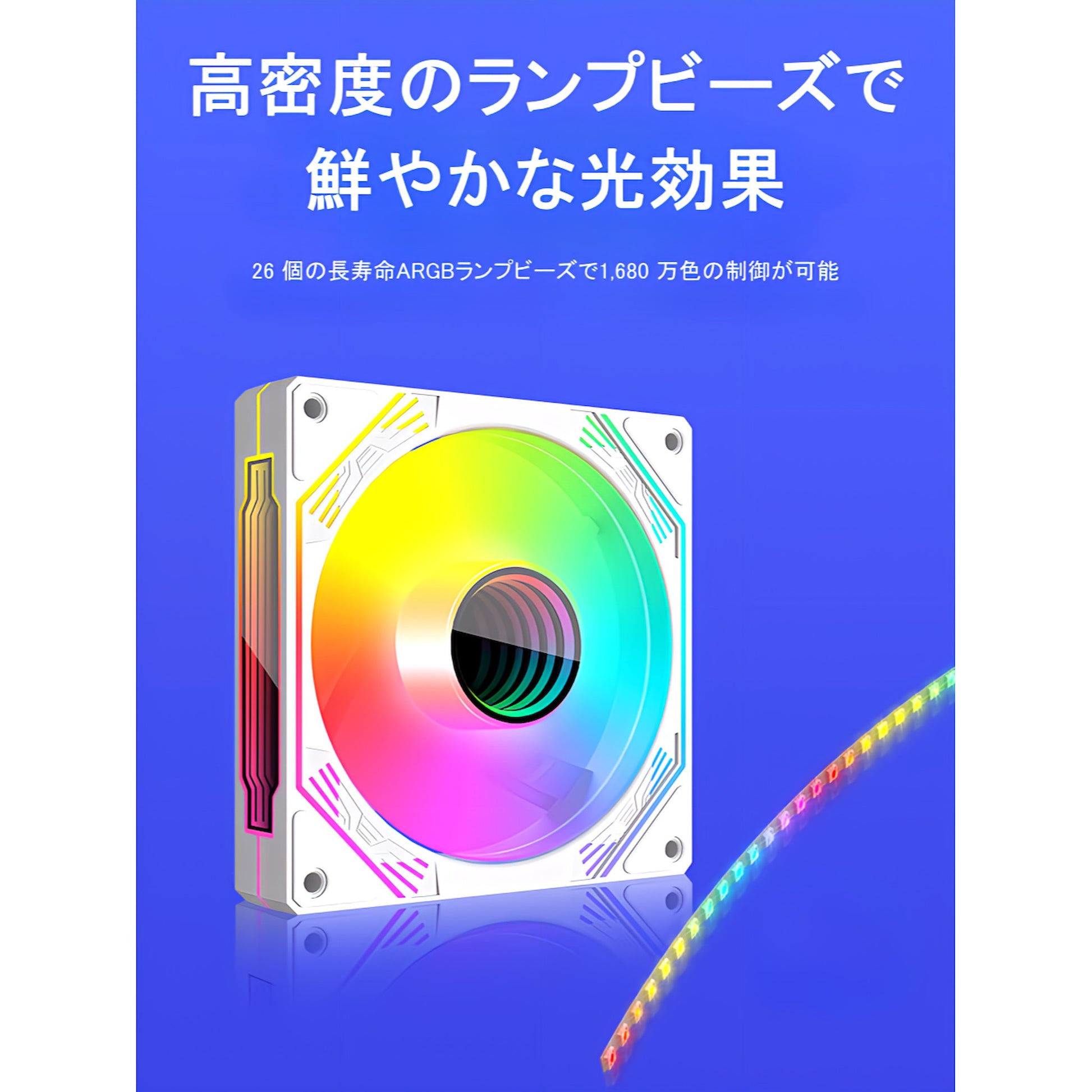 【機能】PCのエアーフロー改善、冷却機能 。ARGB 5v 3pinで制御が可能です。5v 3pin対応のマザーボードやARGBコントローラーで色の変更ができます。