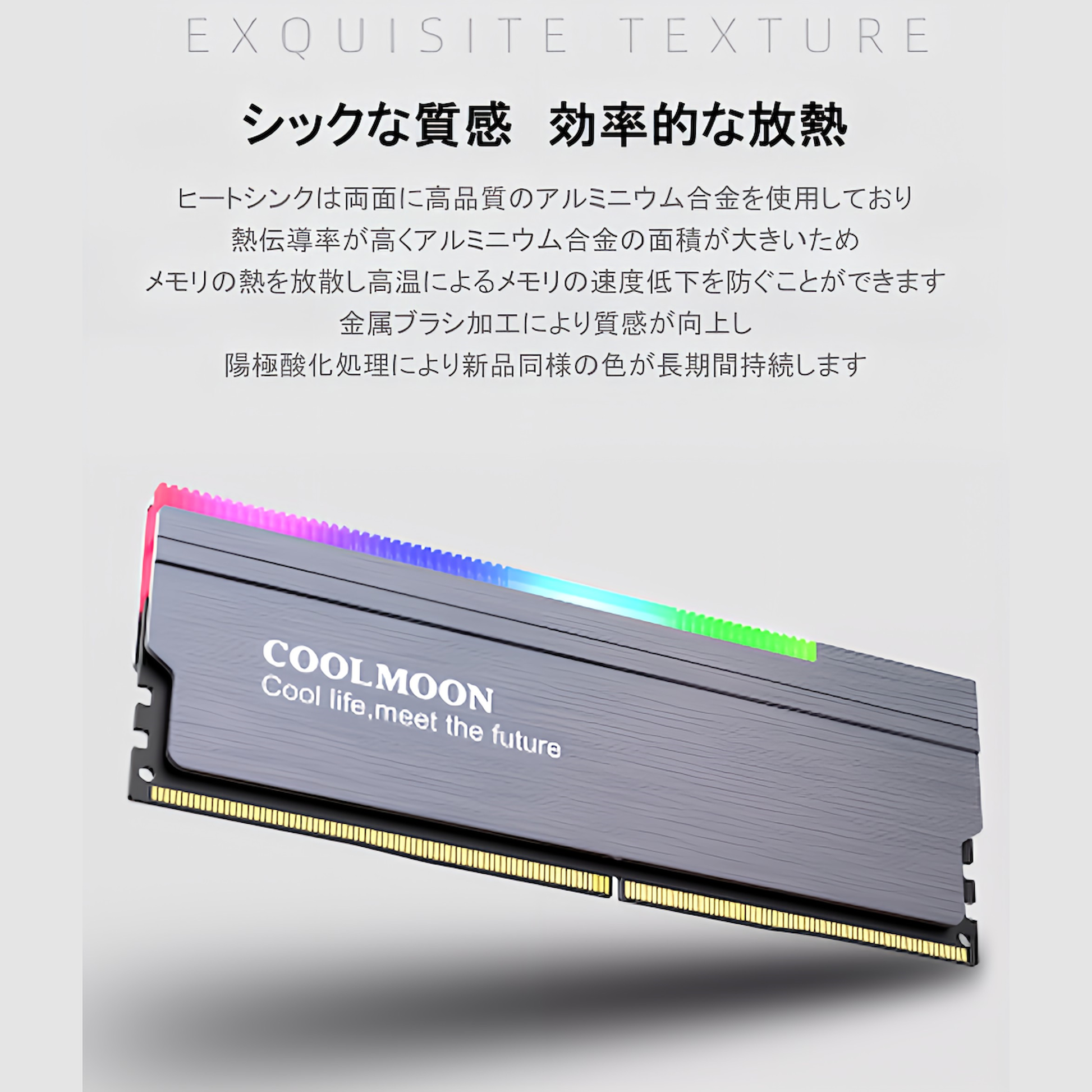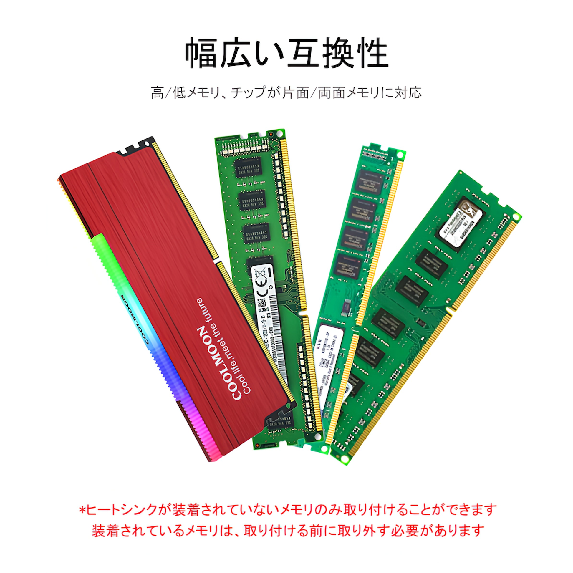 【互換性】DDR3、DDR4、DDR5のメモリに対応。MSI、Asrock、ASUS、Gigabyte様々なマザーボードのARGB 5v 3pinに対応※12v 4pinには対応していないため注意が必要です。取付方法は、両側のヒートシンクを平行にし、中央部分の凹凸箇所を合わせます。その後上側(発光箇所)をカチッと音が鳴るまで押し込みます。(ある程度の力が必要です)