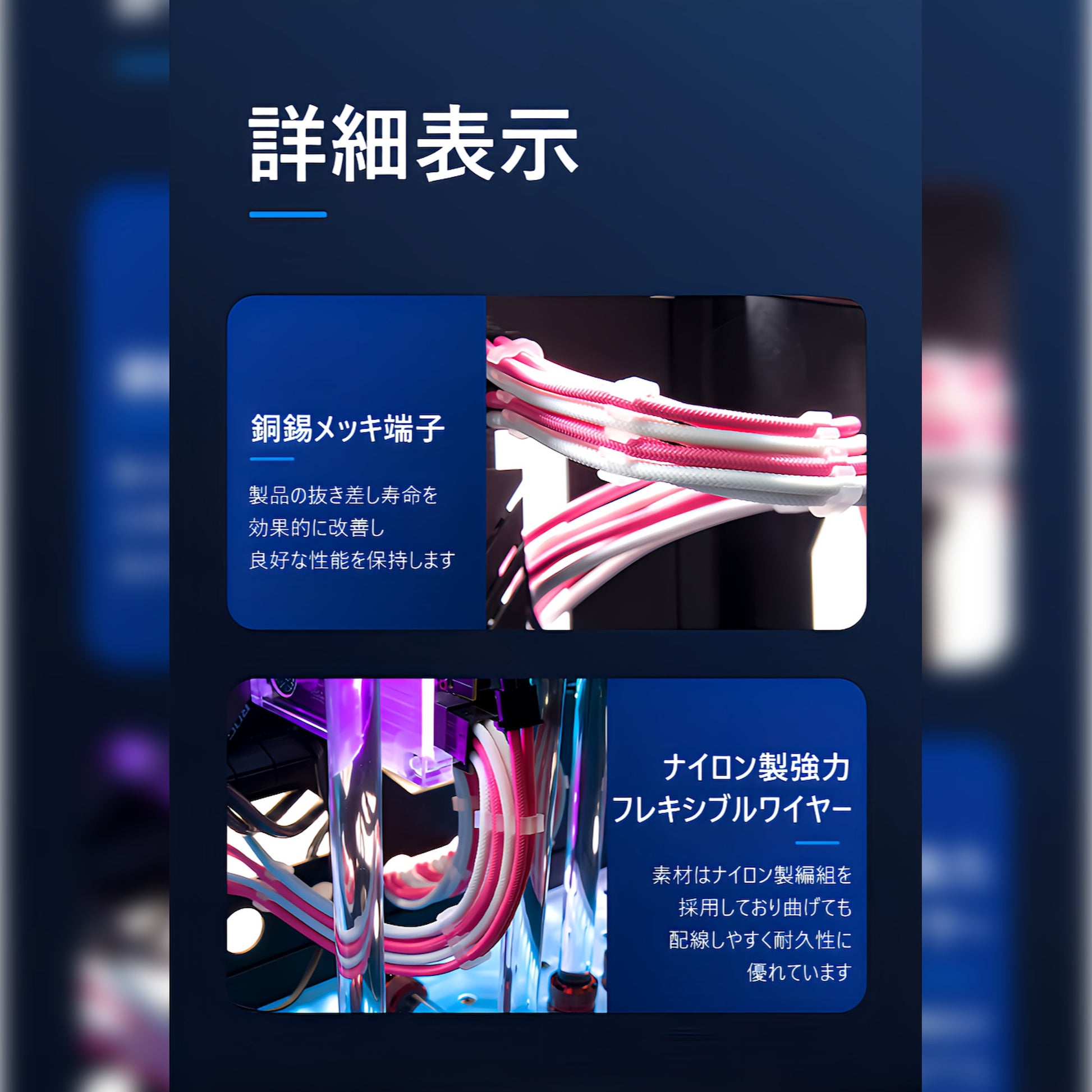 【特徴】カラーリング豊かなラインナップでゲーミングPCを彩ることができます。スリーブケーブルを整理された状態で固定できるケーブルコーム付きで配線を綺麗にすることができます。柔軟性の高いケーブルで様々なPCケースレイアウトに対応できるのが特徴です。